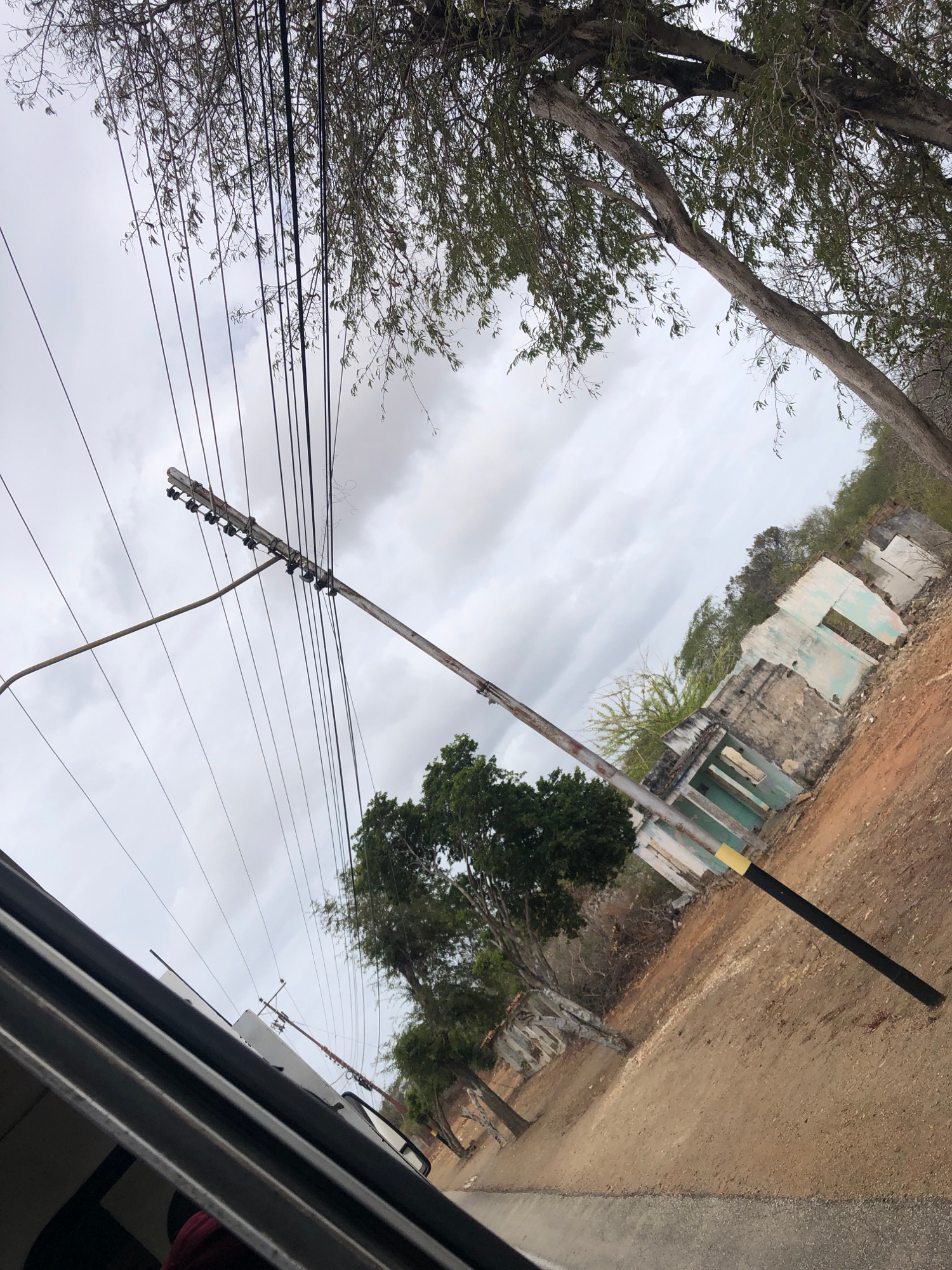 The image, taken from within a vehicle, captures a street scene in Santa Ana, Venezuela, under an overcast sky. The perspective is looking out of a vehicle window, with the dark frame of the window vi…read more