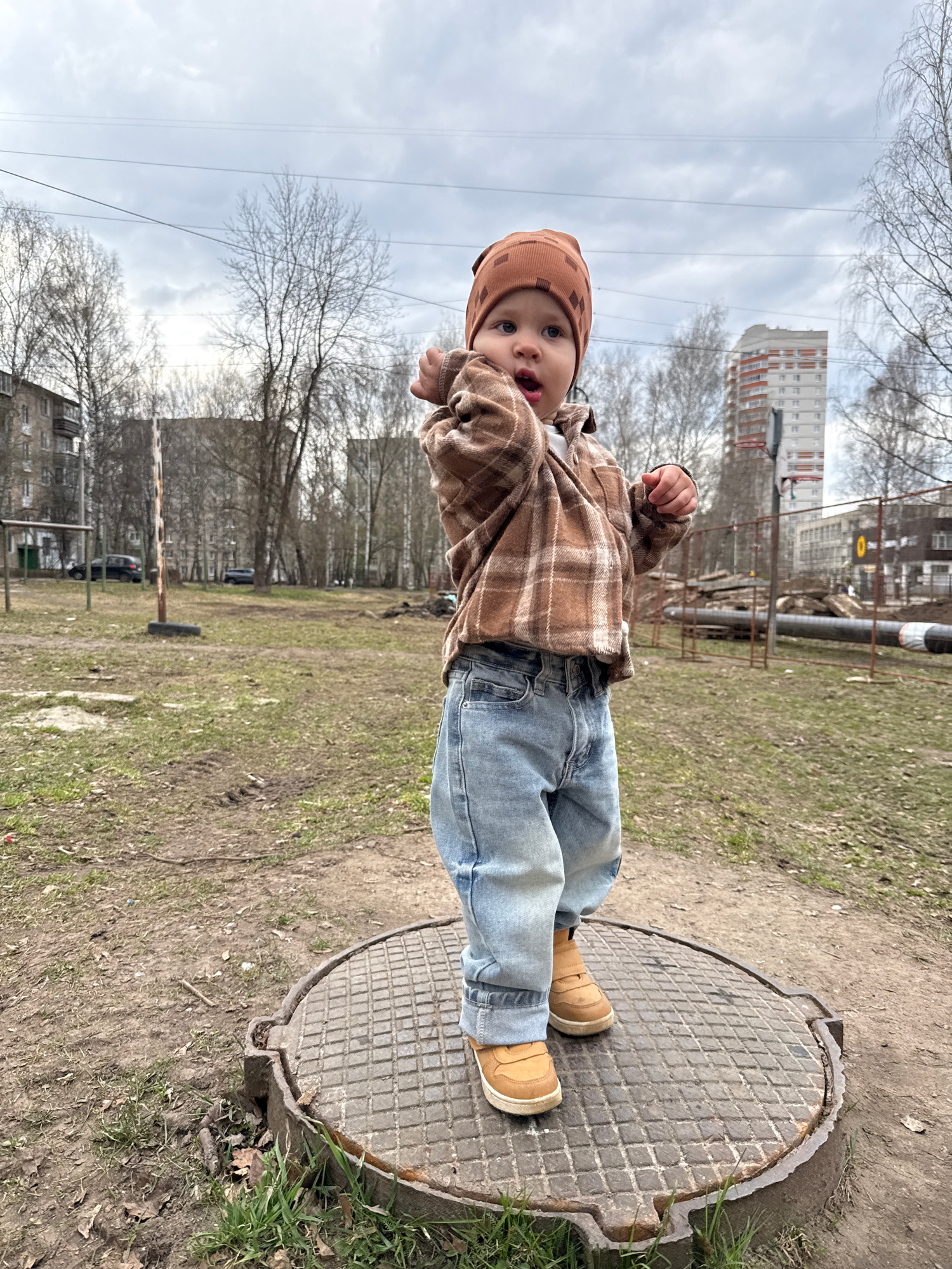 The image captures a young child, likely a toddler, standing upright on a textured, circular manhole cover in an outdoor urban environment. The child is dressed in a brown plaid shirt jacket, light bl…read more