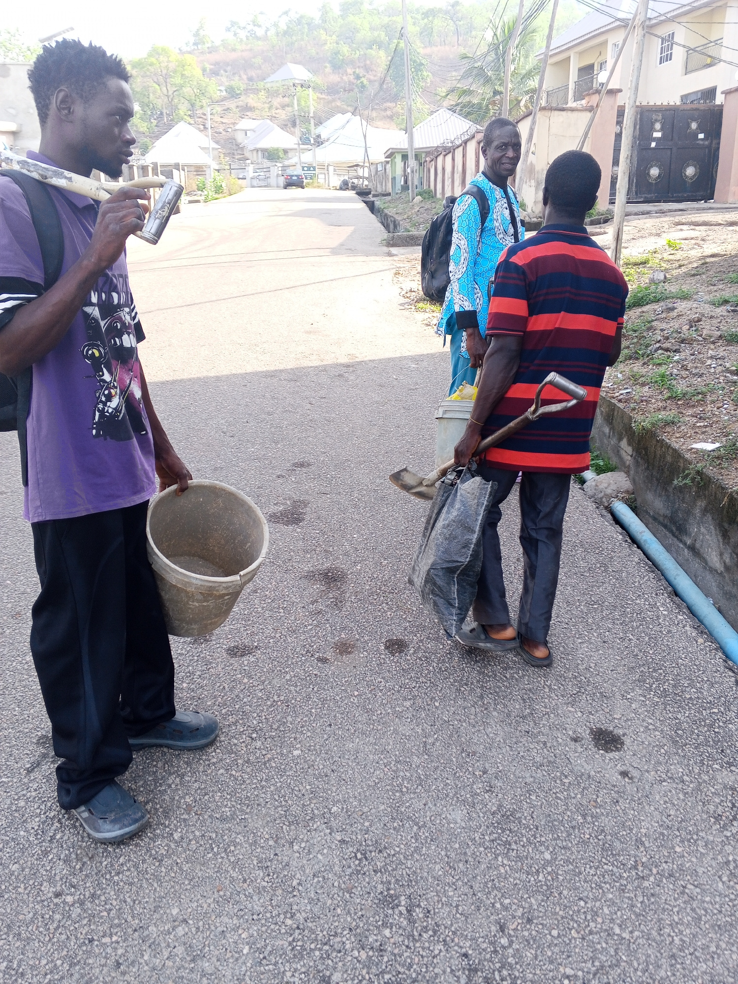 Three men are standing on a paved road in Lokoja, Nigeria. The man on the left is wearing a purple t-shirt, black pants, and grey shoes, carrying a bucket in his right hand and a long pole over his le…read more