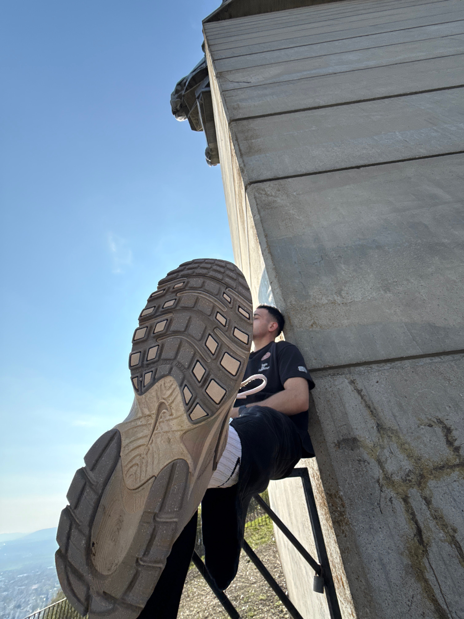 A low-angle, outdoor photograph taken on a sunny day shows a man lying on a concrete ledge with the sole of a shoe prominently displayed in the foreground. The man is lying on his back, wearing a blac…read more