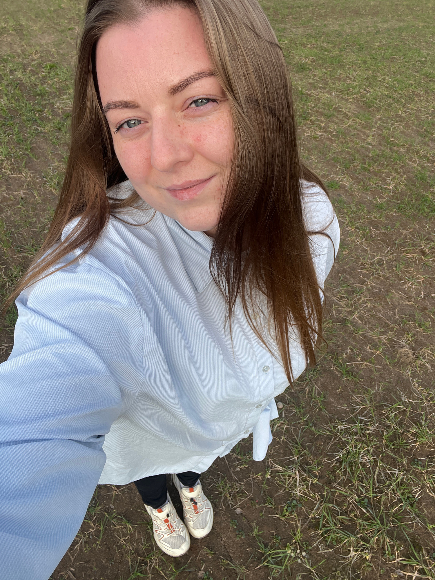 A selfie shot from a high angle shows a woman standing on a patch of grass and dirt. The woman has fair skin, brown hair, and light-colored eyes. She is wearing a light blue striped button-down shirt…read more