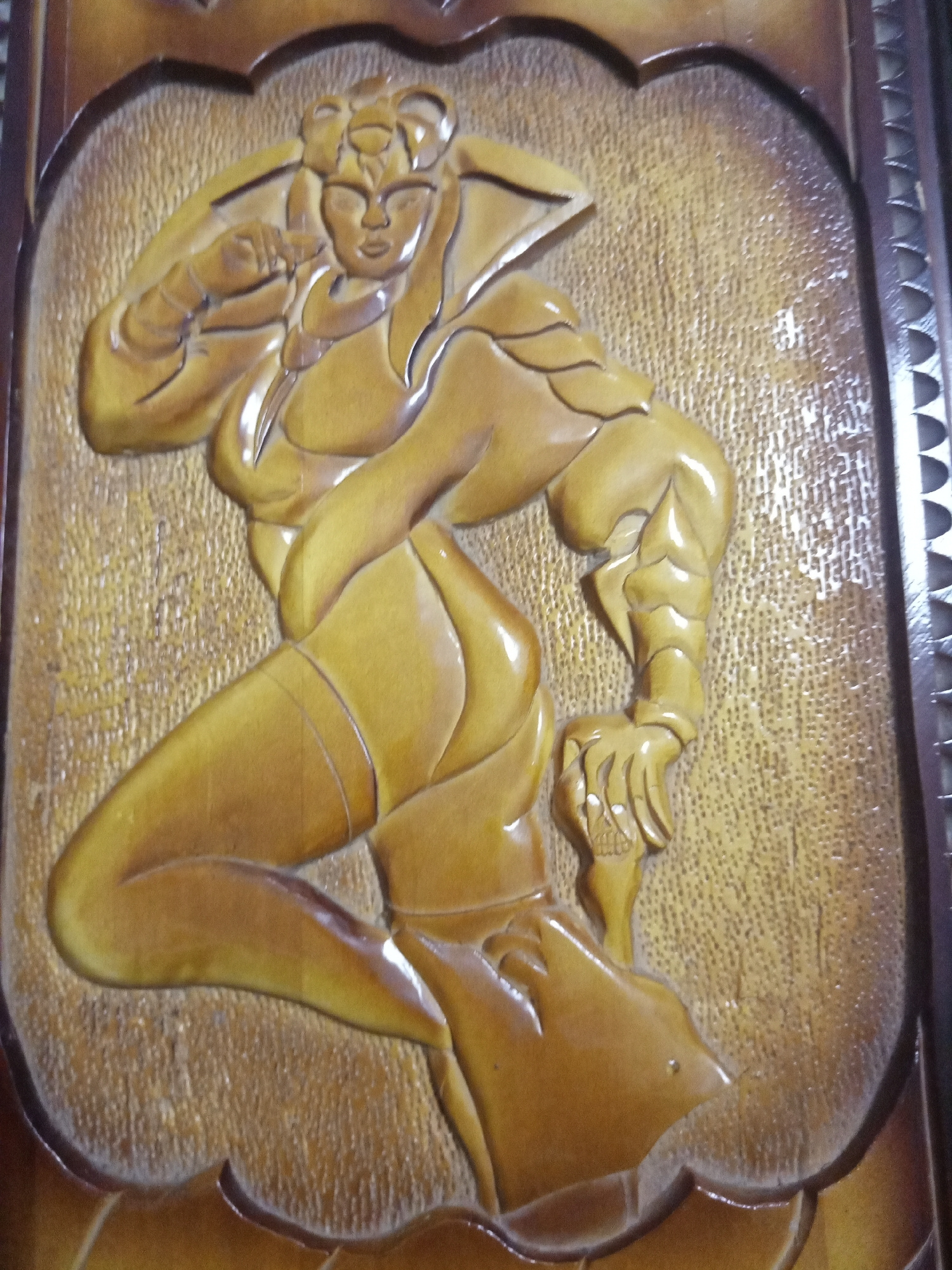 The image shows a wooden carving of a woman, possibly a depiction of a fictional character, in a dynamic pose. The carving is detailed, showcasing muscular features and stylized clothing. The backgrou…read more
