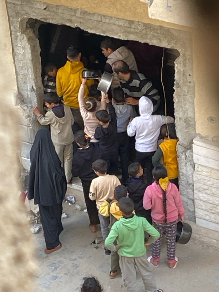 The image captures a crowded scene at the entrance of a concrete structure in Khan Yunis, Palestinian Territory. A large group, predominantly children and young adults, are densely gathered at and wit…read more
