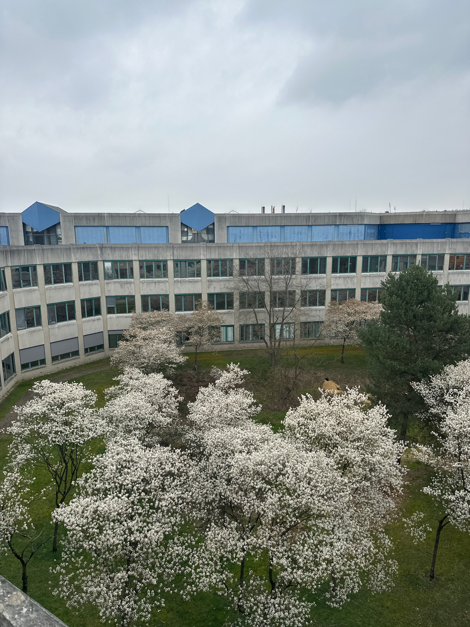 The image shows a tall, concrete building with numerous windows, some covered by blue blinds. At the top and bottom, the building has blue pyramidal architectural features. To the right of the buildin…read more
