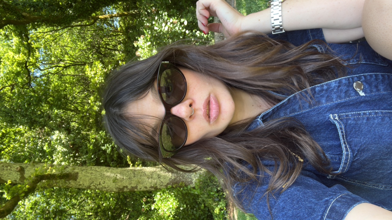 A woman with short, dark hair and sunglasses is holding a smartphone, with bright red fingernails, while seated in a garden. She is wearing a dark olive-green dress with a lace trim. The background is…read more