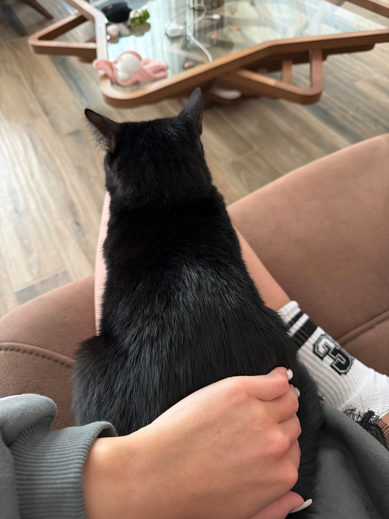 A medium-angle, indoor shot shows a black cat being petted by a person. The cat is lying on the person's lap, oriented from the upper-left to the lower-right of the frame. The person's hand is on the…read more
