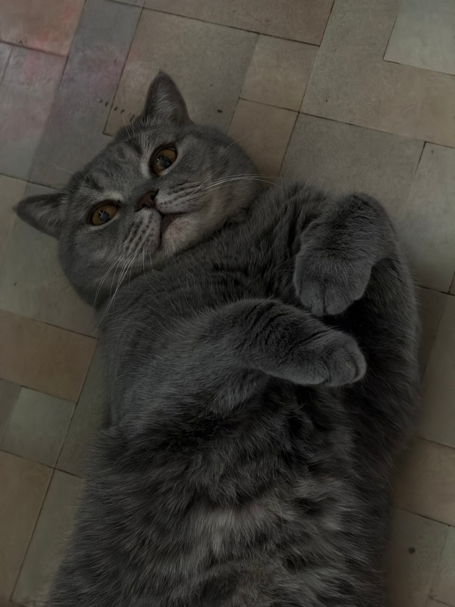 A gray British Shorthair cat is lying on its back on a tiled floor. The cat's paws are curled up near its chest. The cat's head is tilted, looking towards the viewer. The background is a tiled floor.…read more