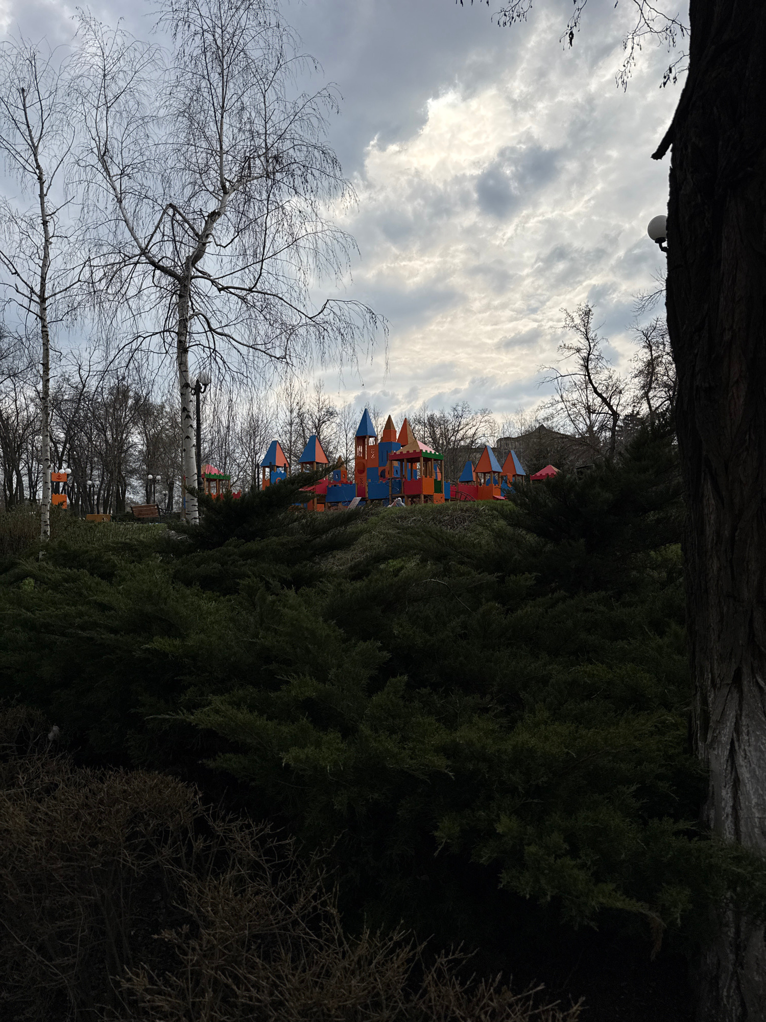 The image depicts a playground nestled within a park-like setting. A structure resembling a castle in bright primary colors is visible beyond a dense row of evergreen trees. To the left, bare trees st…read more