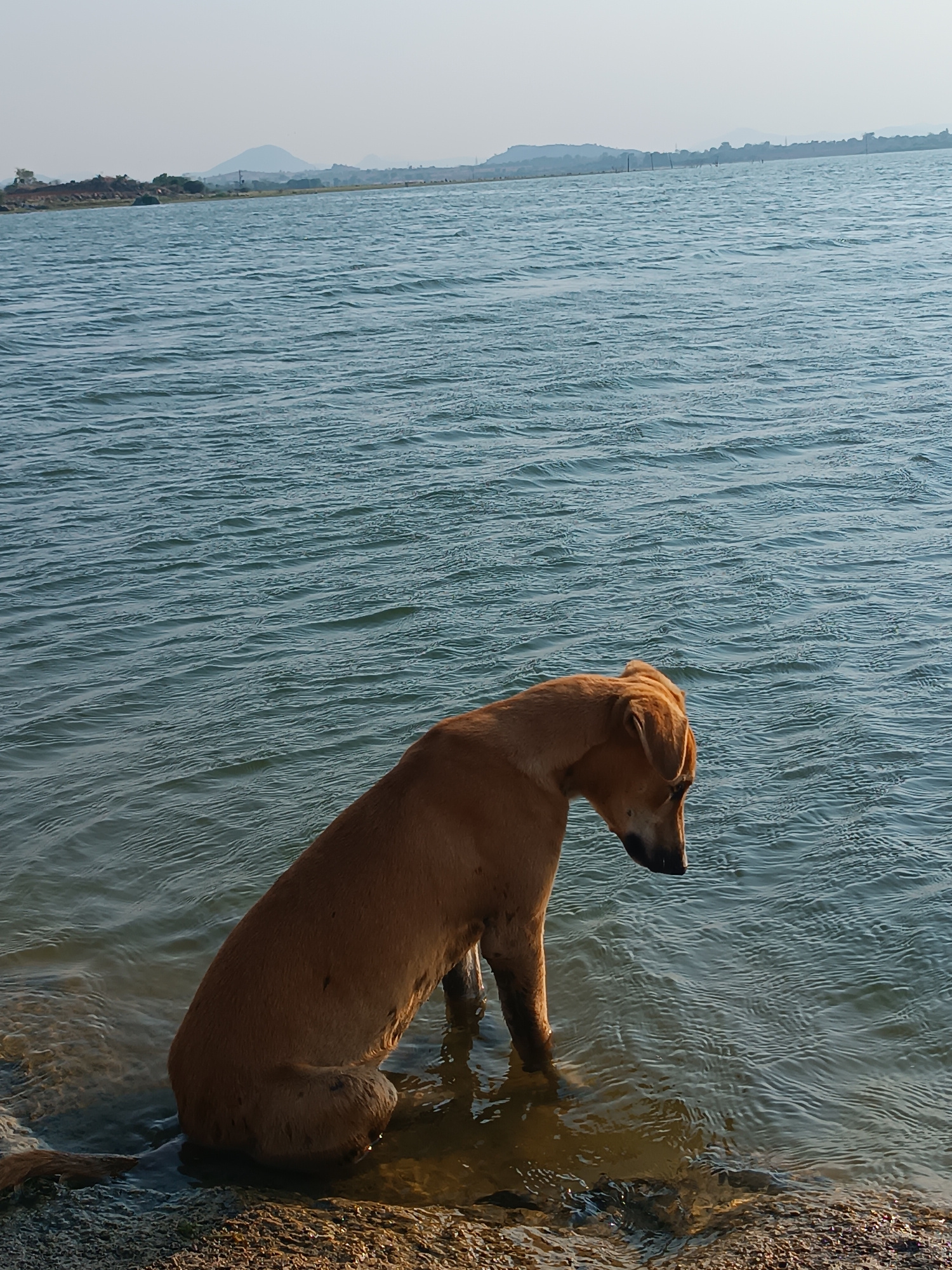 The image depicts a solitary brown dog standing in the shallow water of a lake or river. The dog is positioned near the shoreline with its front legs submerged. The water surface is rippled, suggestin…read more