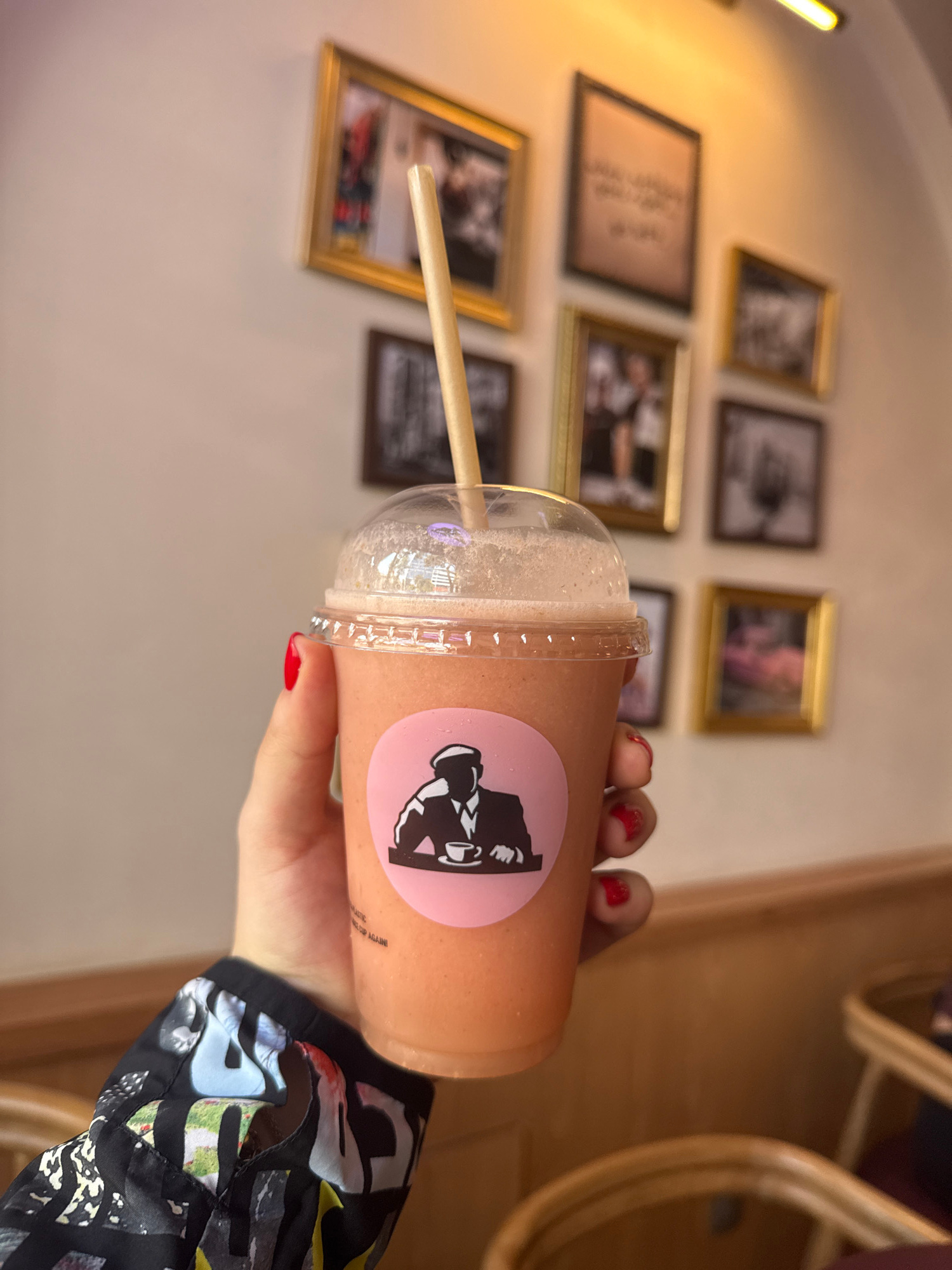 A person's hand, adorned with red nail polish, holds a light orange-colored beverage in a clear plastic cup with a dome lid and a straw. A circular light pink sticker on the cup displays a black and w…read more