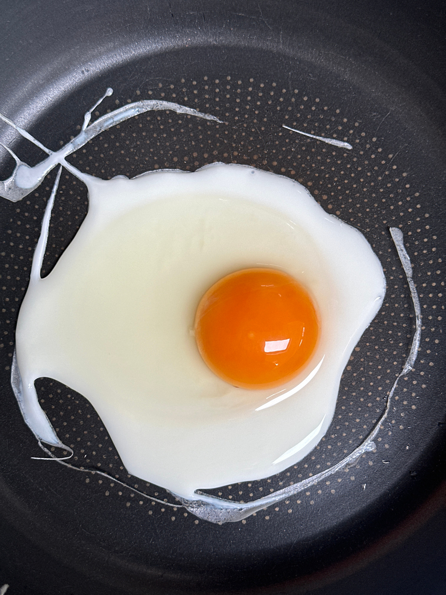 A fried egg is centered in a black frying pan with a speckled surface. The egg consists of a bright orange yolk surrounded by a white albumen. The egg white has spread out and partially coagulated in…read more