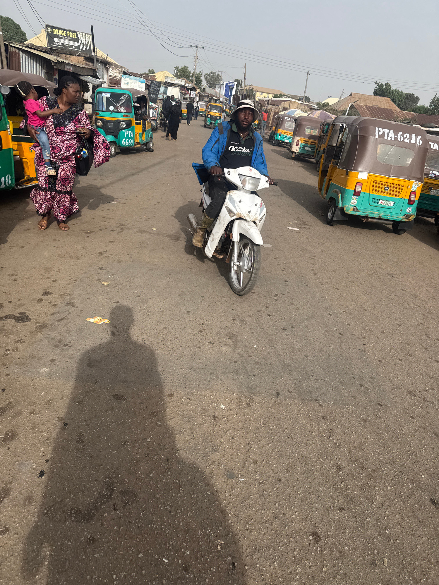 The image depicts a street scene in Jos, Nigeria. A man on a white motorcycle is traveling down the street. A row of auto rickshaws (tuk-tuks) are parked along the roadside. One tuk-tuk is occupied by…read more