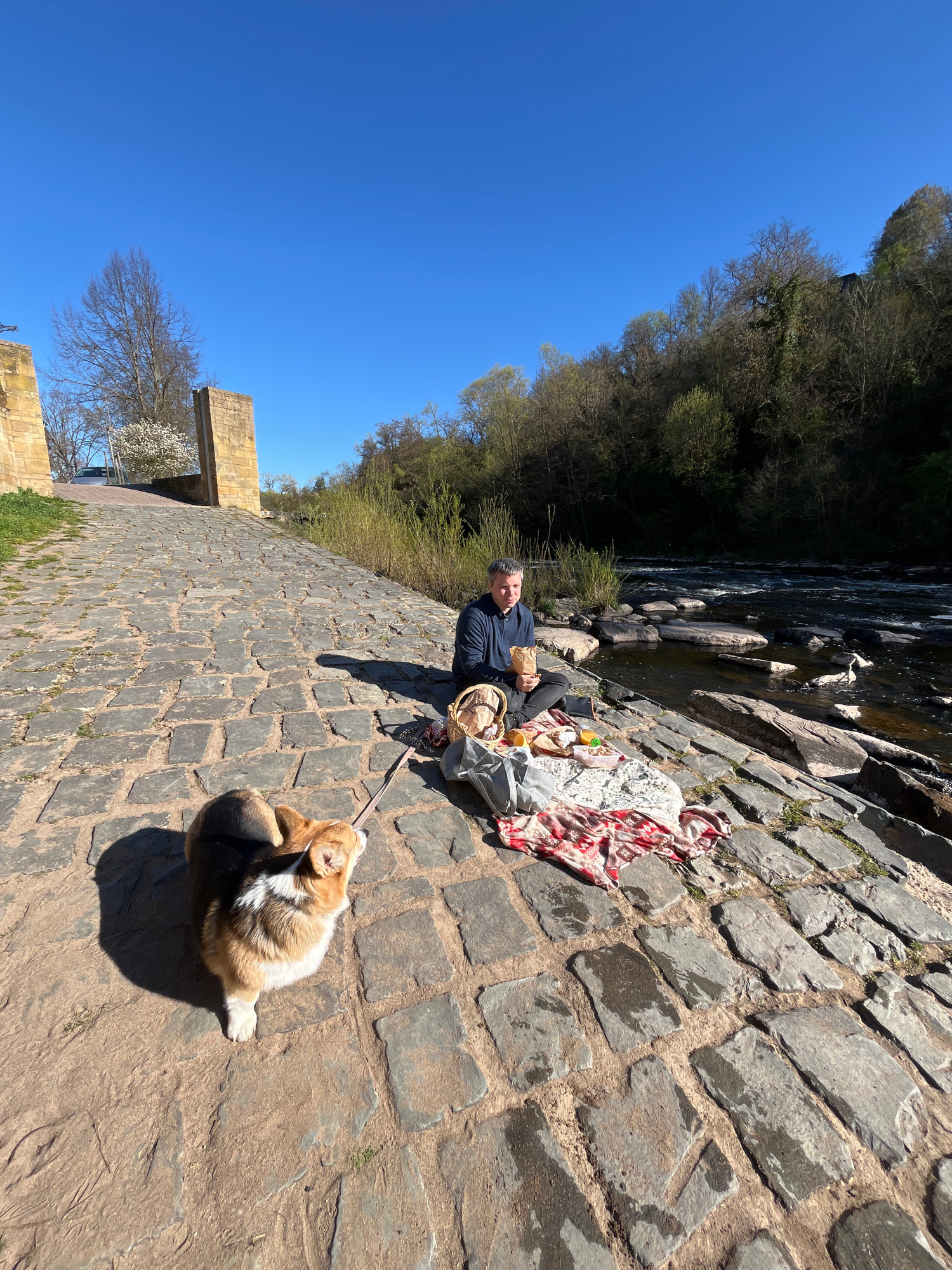 A man is sitting on a stone ledge with a picnic spread next to a body of water. He is wearing a navy jacket and dark pants, and has a picnic basket and blanket beside him. The water appears to be casc…read more