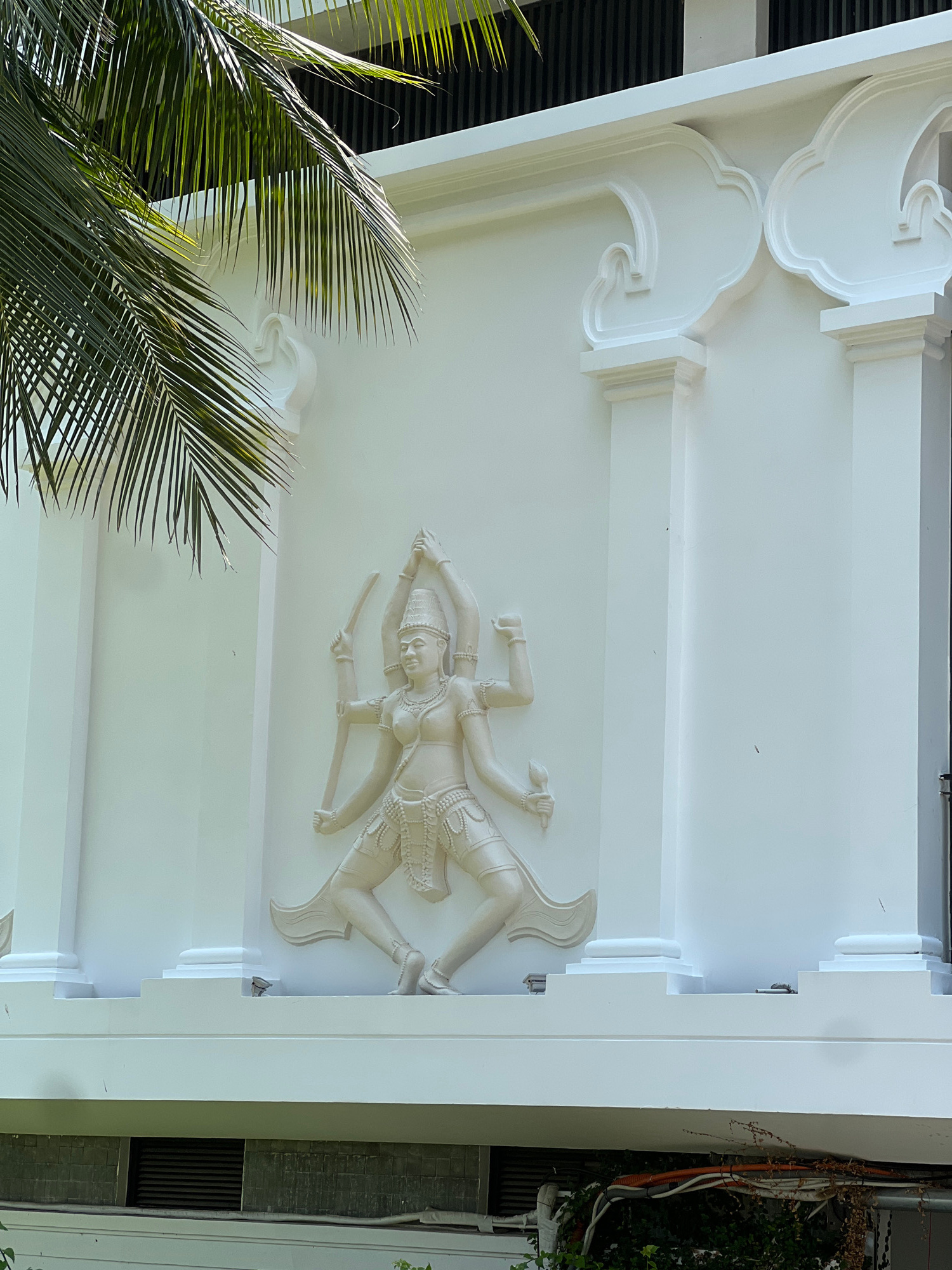 A low-angle, sunlit shot reveals a decorative structure in Tây Nha Trang, Vietnam. A white exterior wall features an ornate relief of a multi-armed figure, possibly a deity or mythological character.…read more