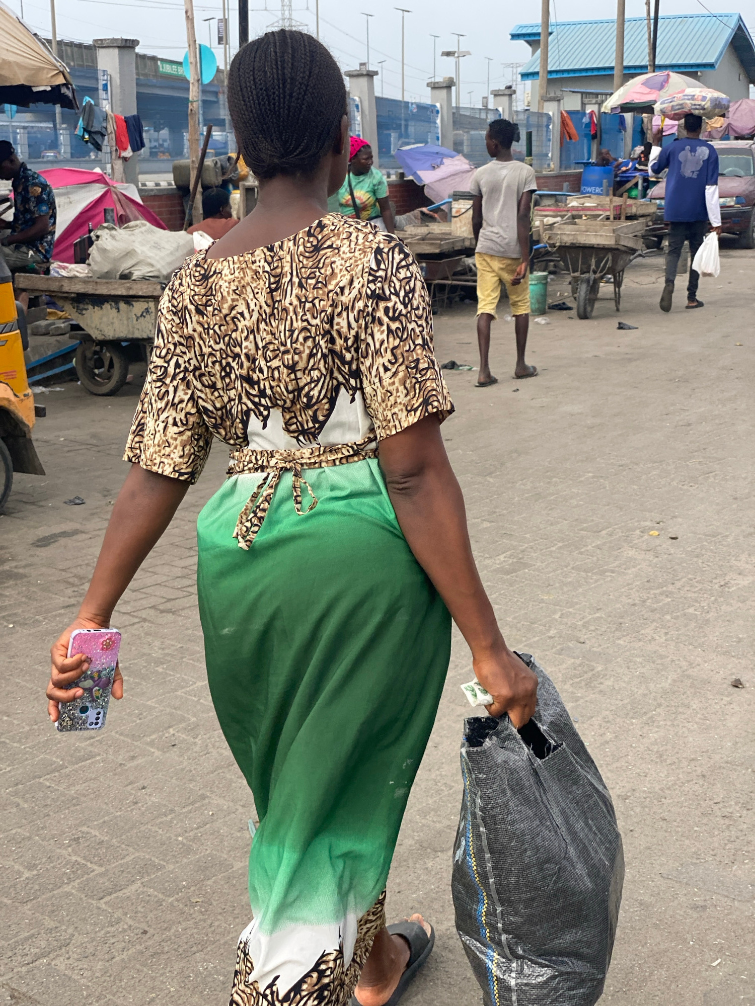 The image shows a woman in Lekki, Nigeria, standing on a concrete surface typical of a public area. She is wearing a patterned top, a green skirt, and sandals. She holds a black bag in one hand and a…read more