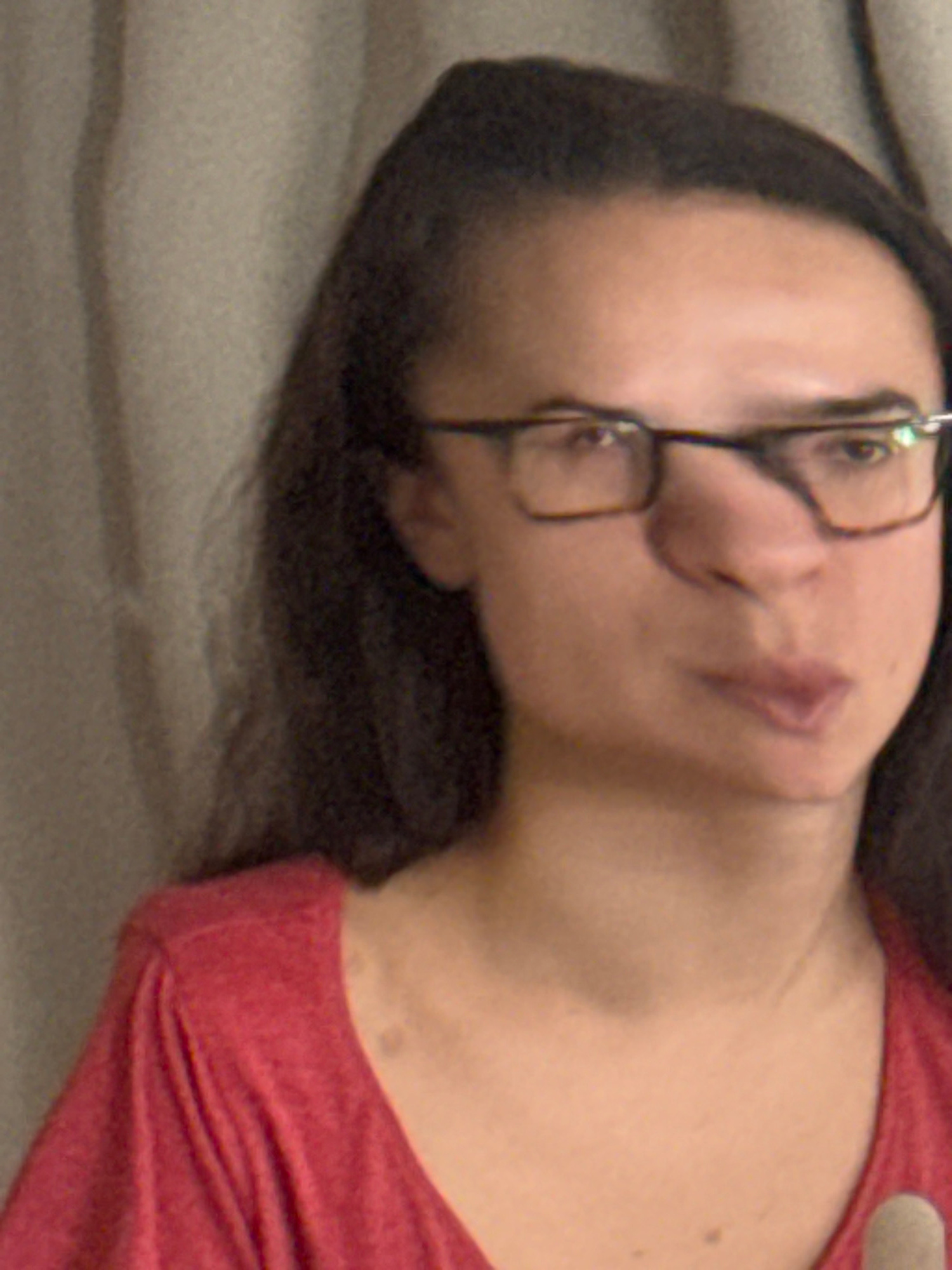 A woman with dark hair and glasses is lying down on a gray surface. She is wearing a red shirt. The location is not identifiable.