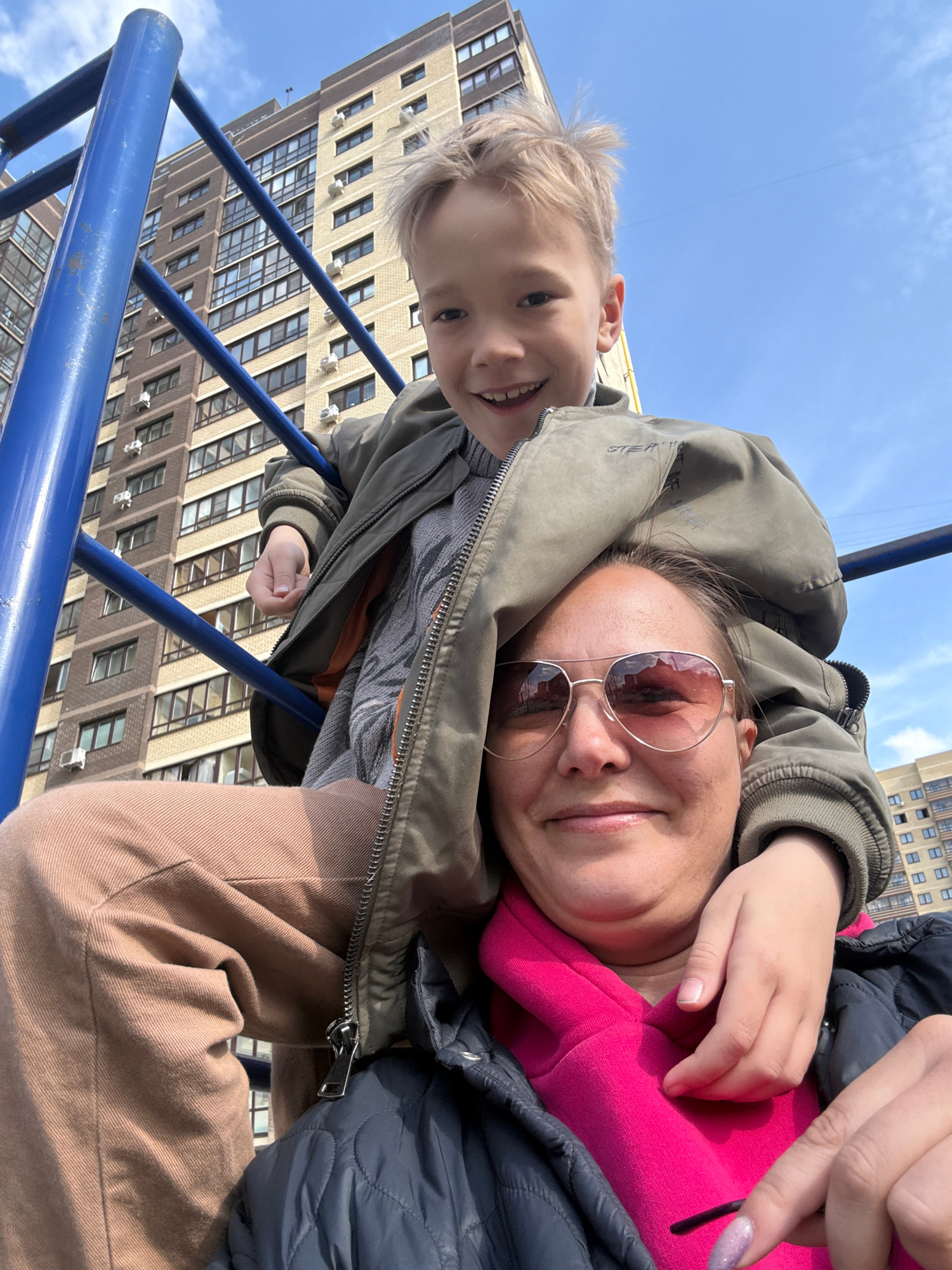 A selfie of a smiling woman wearing sunglasses and a smiling boy with blond hair and a jacket, taken at a playground in Dmitrov, Russia. The woman is wearing a pink shirt and a black jacket, and the b…read more