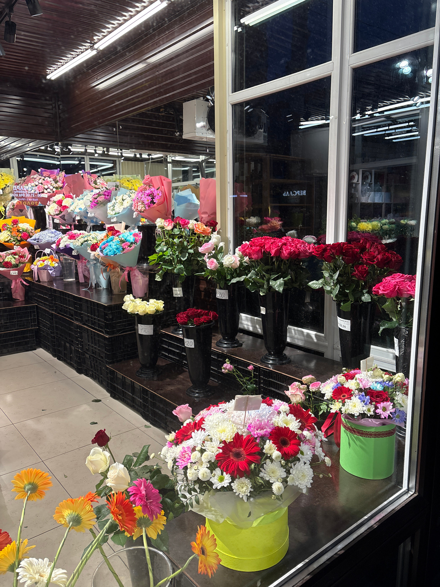 This image captures a vibrant and extensive display of flowers within what appears to be a flower shop, viewed through a large glass window. The scene is brightly lit by artificial lights, casting ref…read more