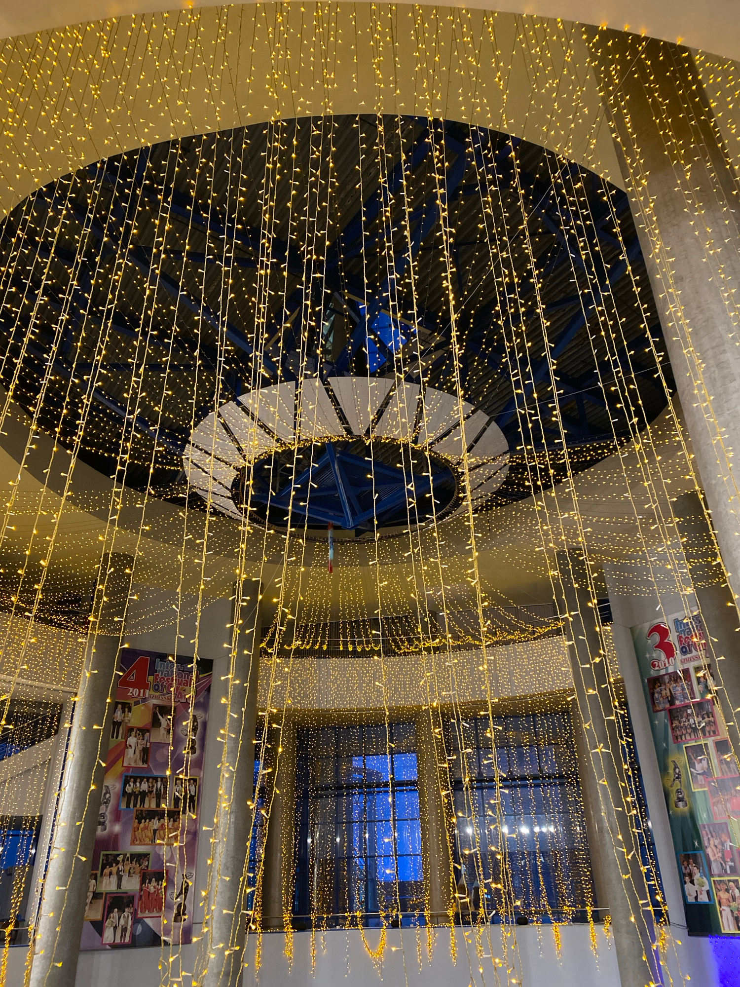 This indoor image, taken in Izhevsk, Russia, shows a complex architectural element adorned with strings of small yellow lights. The primary element is a large, circular structure with a blue and white…read more