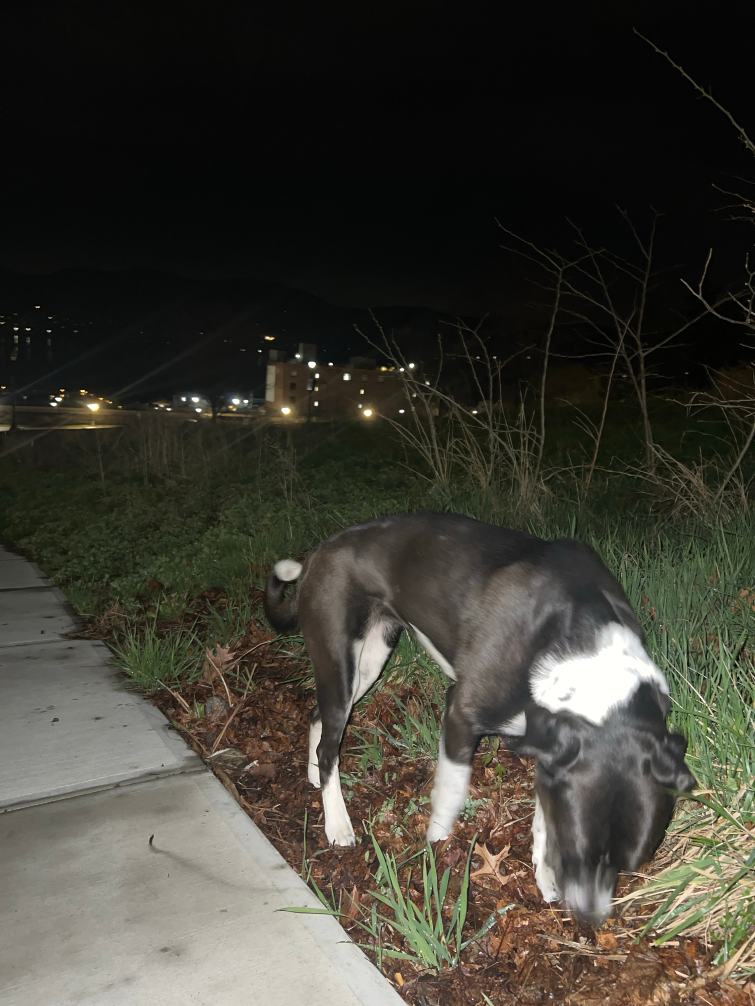The image shows a black and white dog sitting on the grass and leaves next to a sidewalk. In the background, there are buildings and streetlights, suggesting an urban environment at night. The locatio…read more