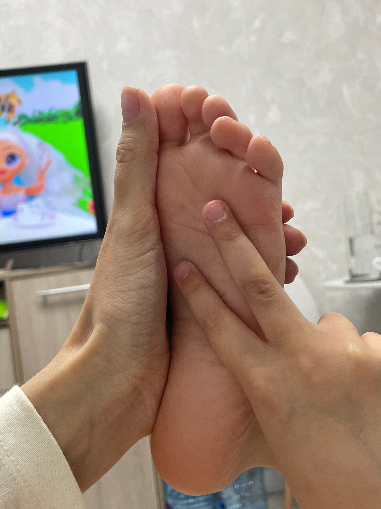A close-up, indoor shot captures a person's hands gently holding their own bare right foot. The hands, appearing to belong to a single individual, are positioned to cup and potentially massage the sol…read more