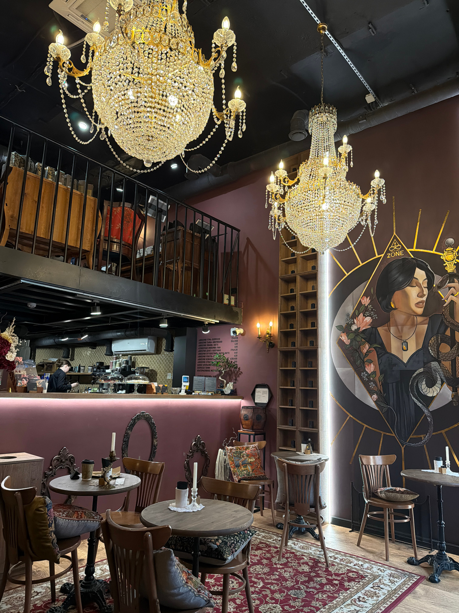 The image shows the interior of a cafe or restaurant, possibly located in Moscow, Russia, given the Cyrillic text on a menu board. The scene is observed from an elevated perspective, with two ornate c…read more