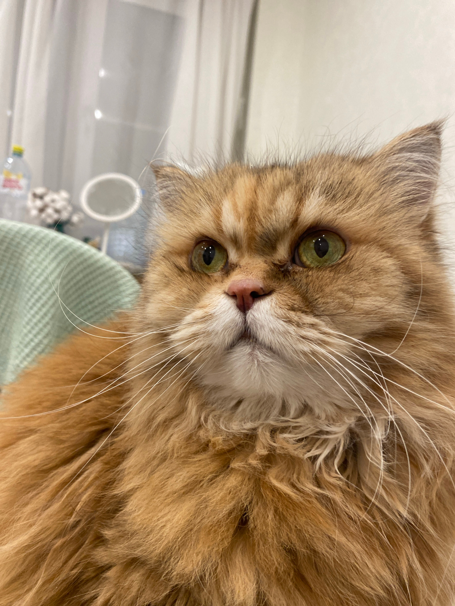 The image shows a close-up of a fluffy, golden-brown cat with green eyes and a pink nose. The cat's head is tilted to the left. Long white whiskers extend from its face. The background is blurry, but…read more