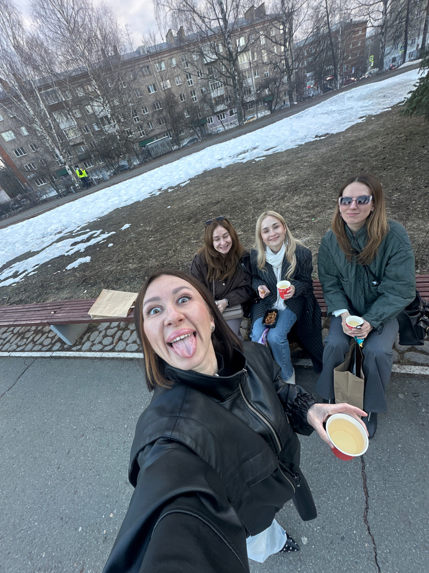 Four young women are sitting on a park bench. They are dressed in jackets and appear to be drinking something, possibly coffee or tea. The woman closest to the camera is taking a selfie and sticking h…read more