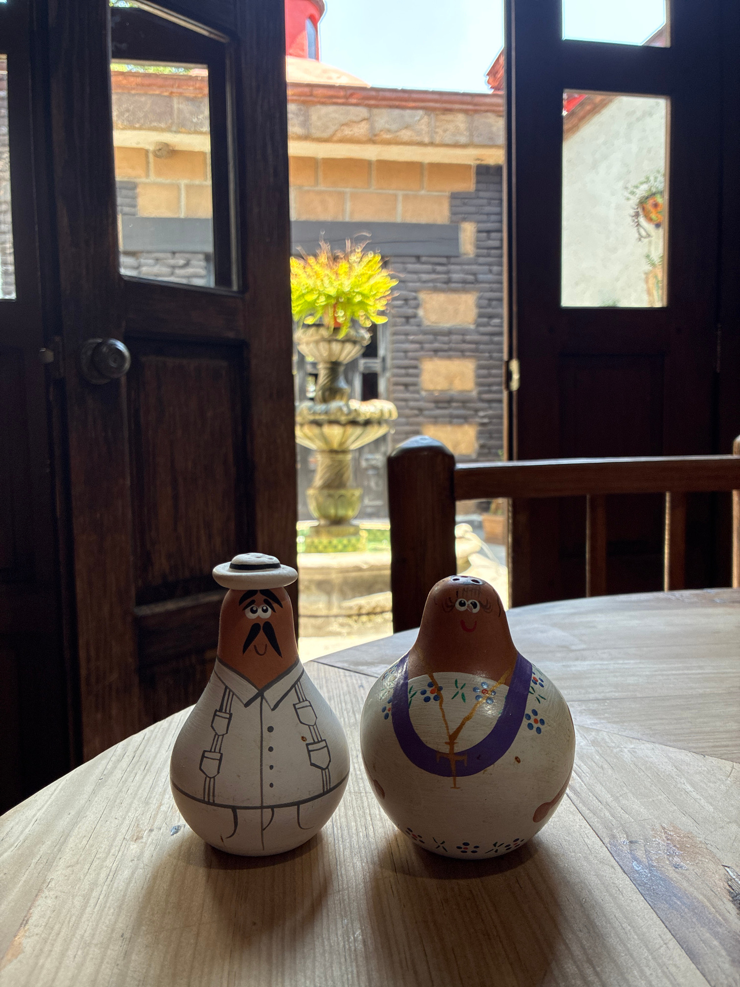 The image shows two decorative ceramic figures on a wooden surface, likely a table. One figure depicts a person with a hat and a suit painted on its body, while the other has floral and geometric desi…read more
