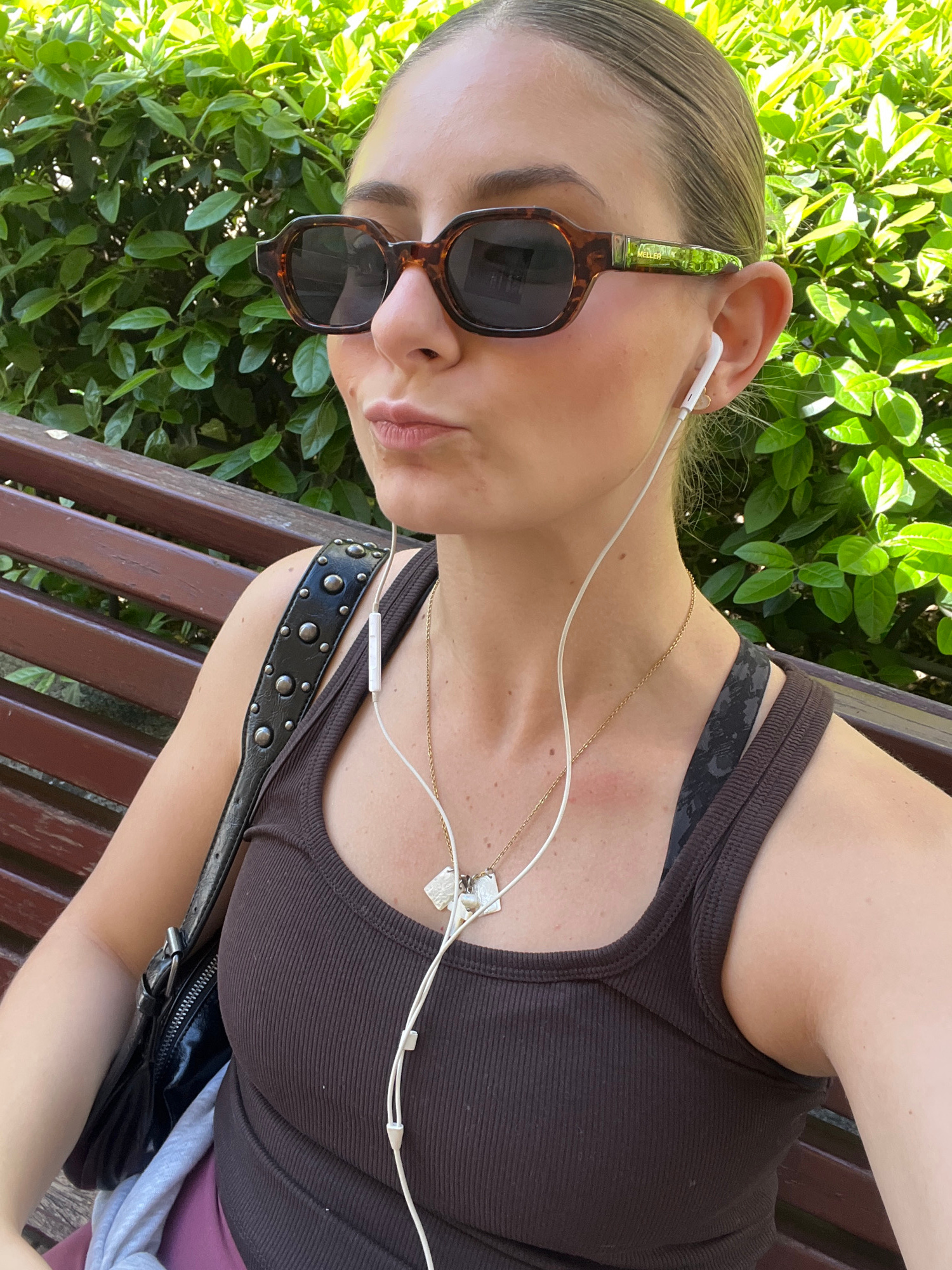 A young woman sits on a park bench. She is wearing a brown tank top, sunglasses, and wired earphones. She has a black studded purse slung across her body. Two gold necklaces are visible. She is positi…read more