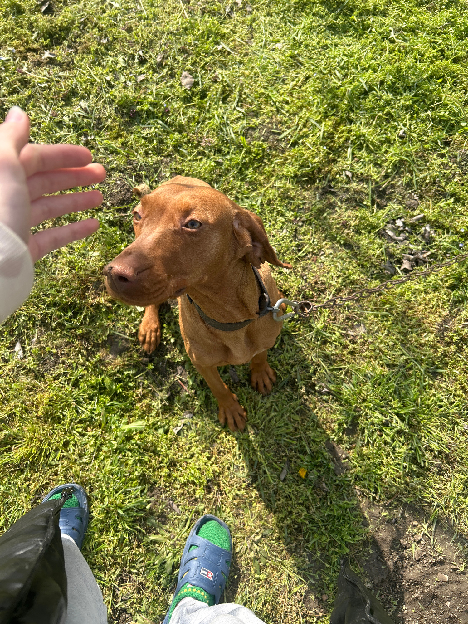 A medium-sized brown dog is lying on green grass. The dog has a collar and chain leash. A person is standing near the dog, reaching out a hand toward it. Another person is standing nearby, wearing blu…read more