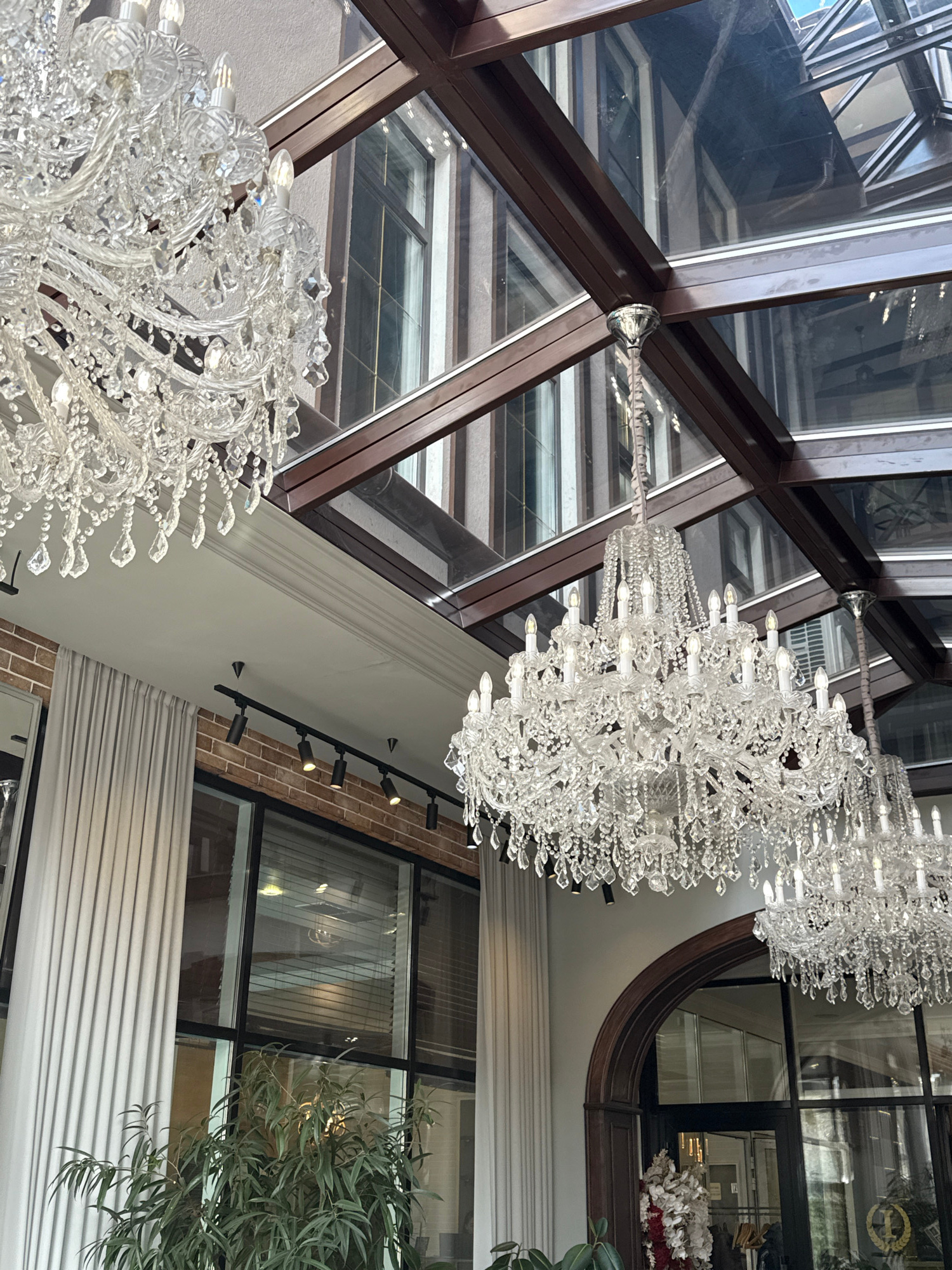 The image depicts an opulent interior space in Estosadok, Russia. A multi-paneled glass roof, supported by dark brown metal beams, forms the primary ceiling structure, admitting natural light. Three o…read more