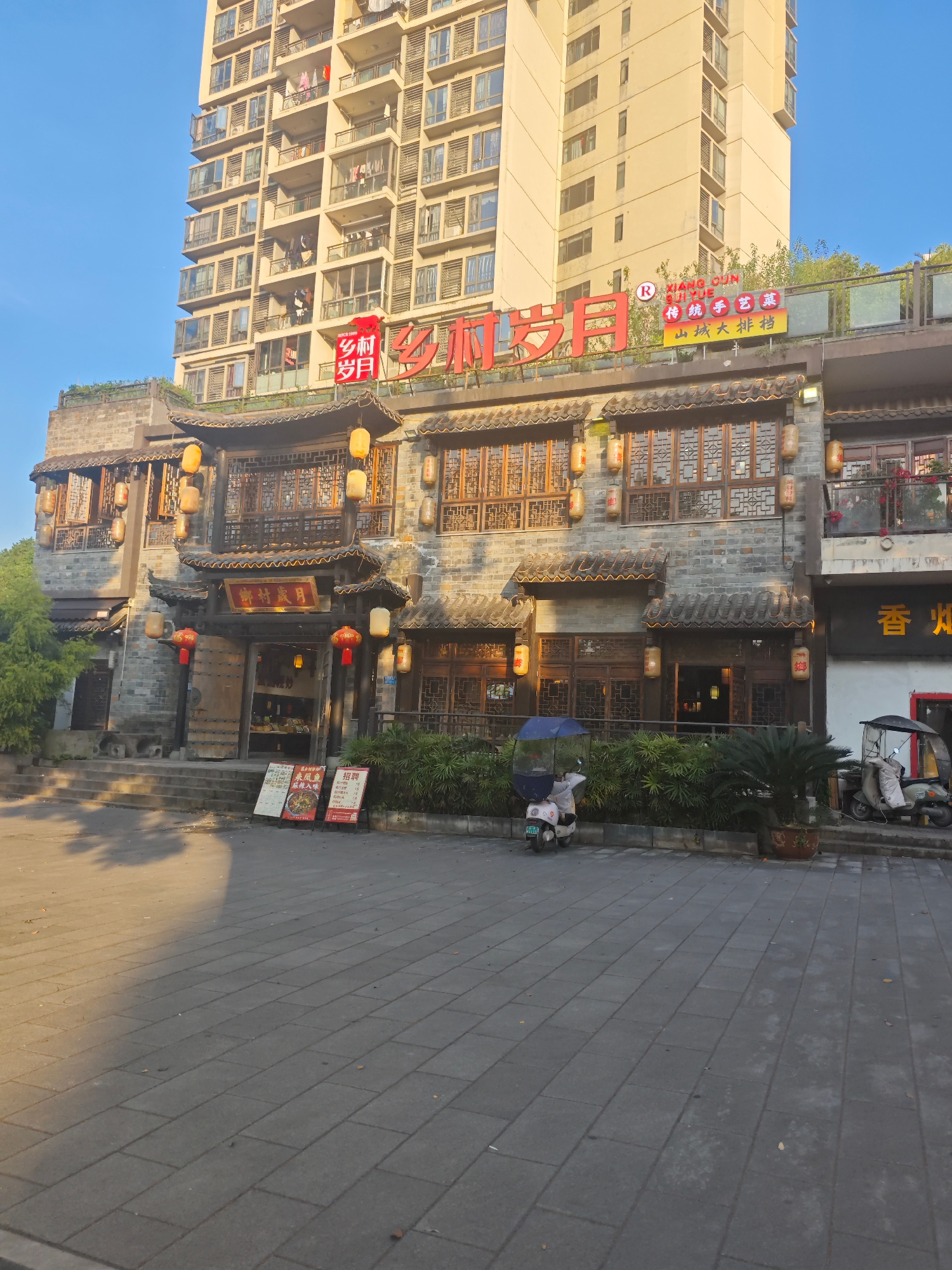 The image shows a restaurant called "Xiang Cun Sui Yue" in Chongqing High-tech Zone, China. The restaurant is designed with traditional Chinese architecture, featuring gray brick walls, wooden windows…read more