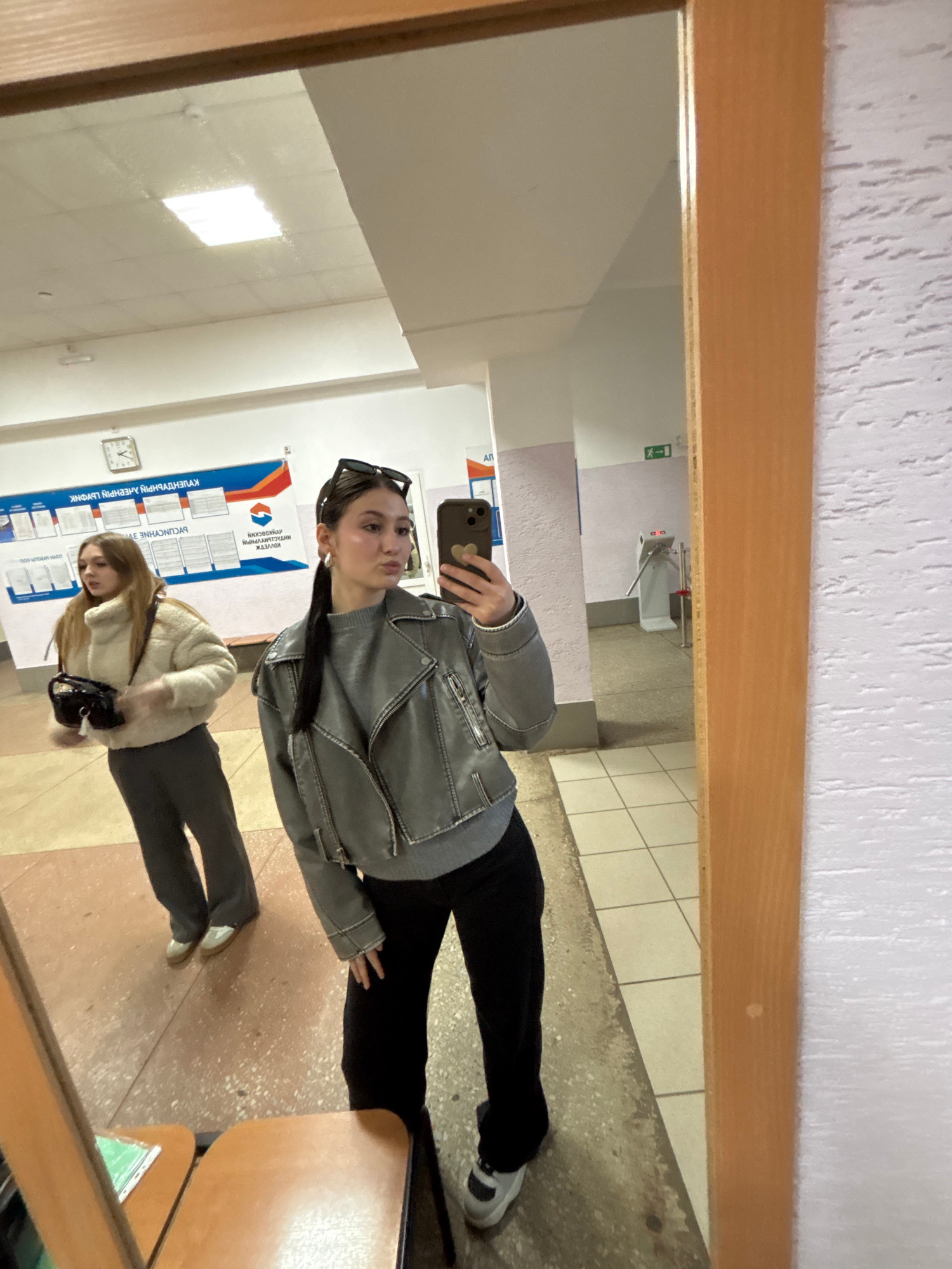 The image displays a mirror selfie taken by a young woman in what appears to be a public building, such as a school or administrative office, located in Chaikovsky, Russia. The primary subject, center…read more