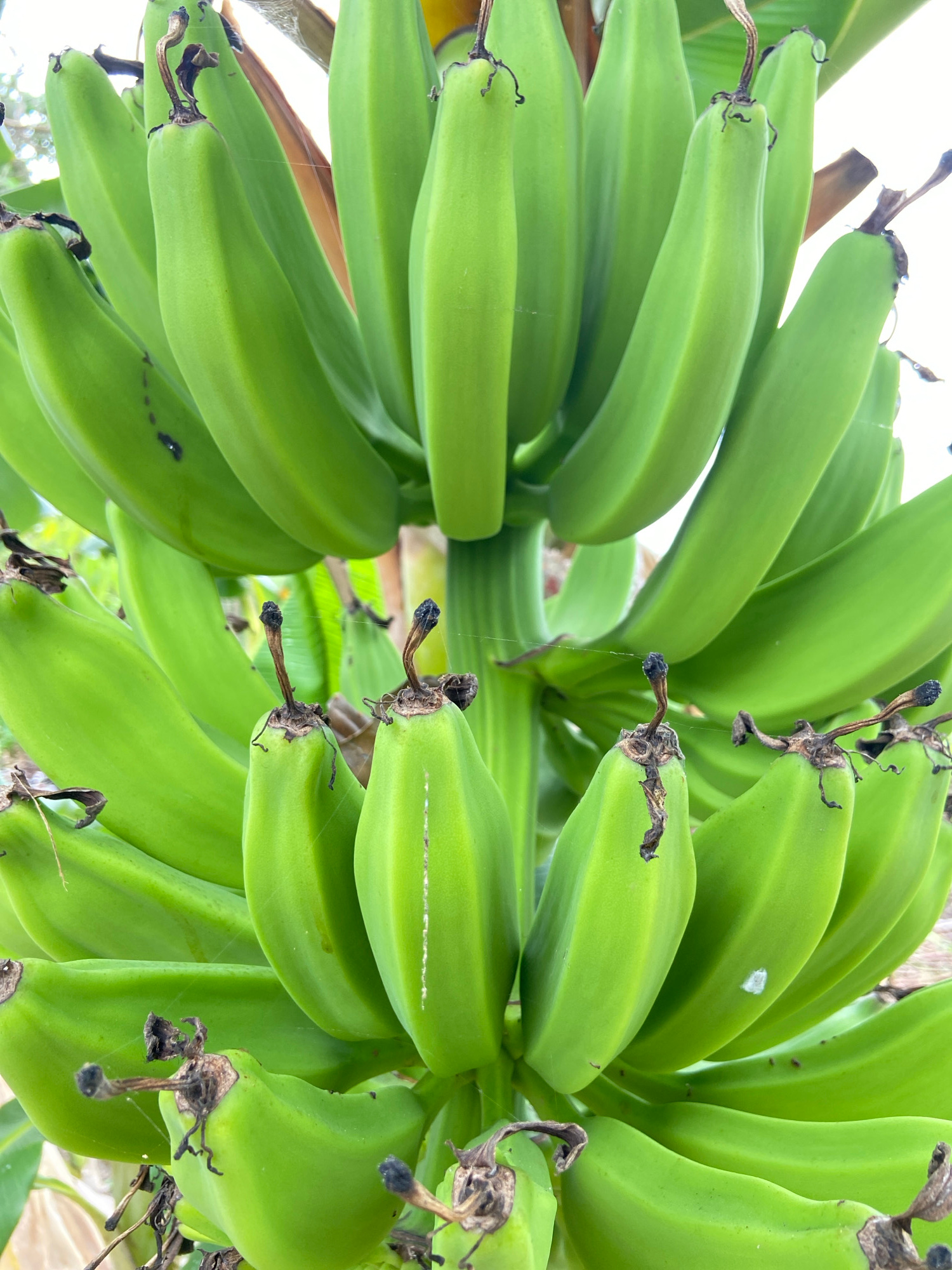 A close-up, upward-facing shot features two large bunches of unripe green bananas. The bananas are tightly packed together, and their blunt, squared-off tips are clearly visible. Each banana has a dar…read more