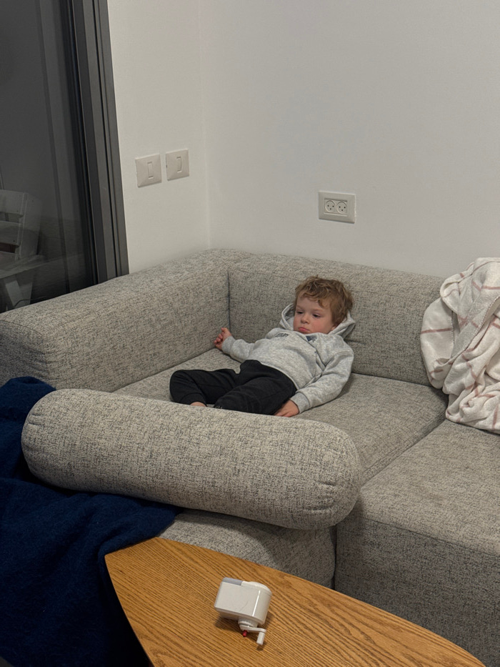 An indoor scene depicts a young child seated on a light grey modular sofa, likely in a residential living space in Tel-Aviv, Israel. The location is identified by the visible Type H electrical outlet…read more