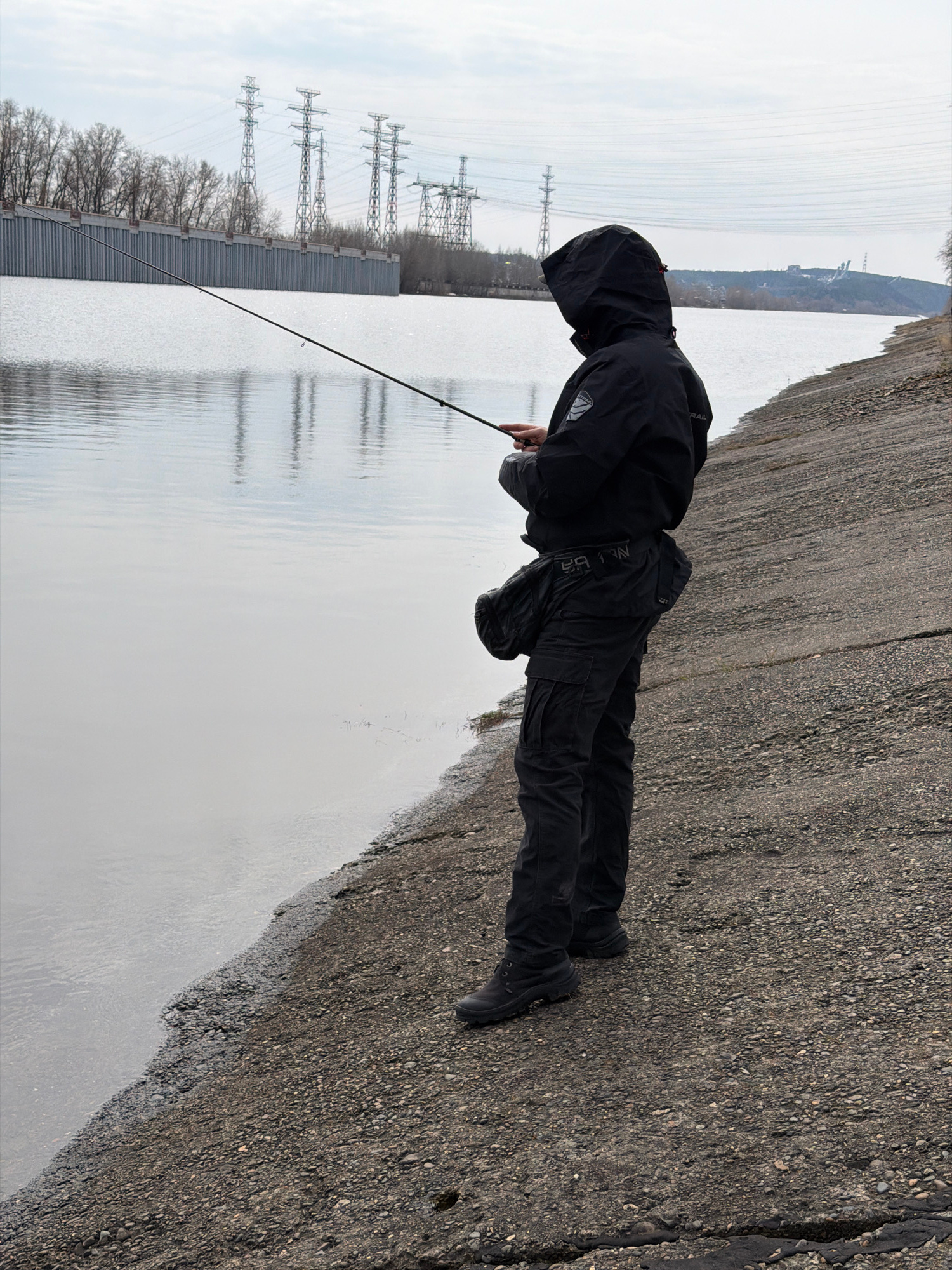 A person dressed in all black clothing, including a hooded jacket, is fishing at a body of water. The person is standing on a concrete or asphalt surface near the edge of the water, holding a fishingβ¦read more