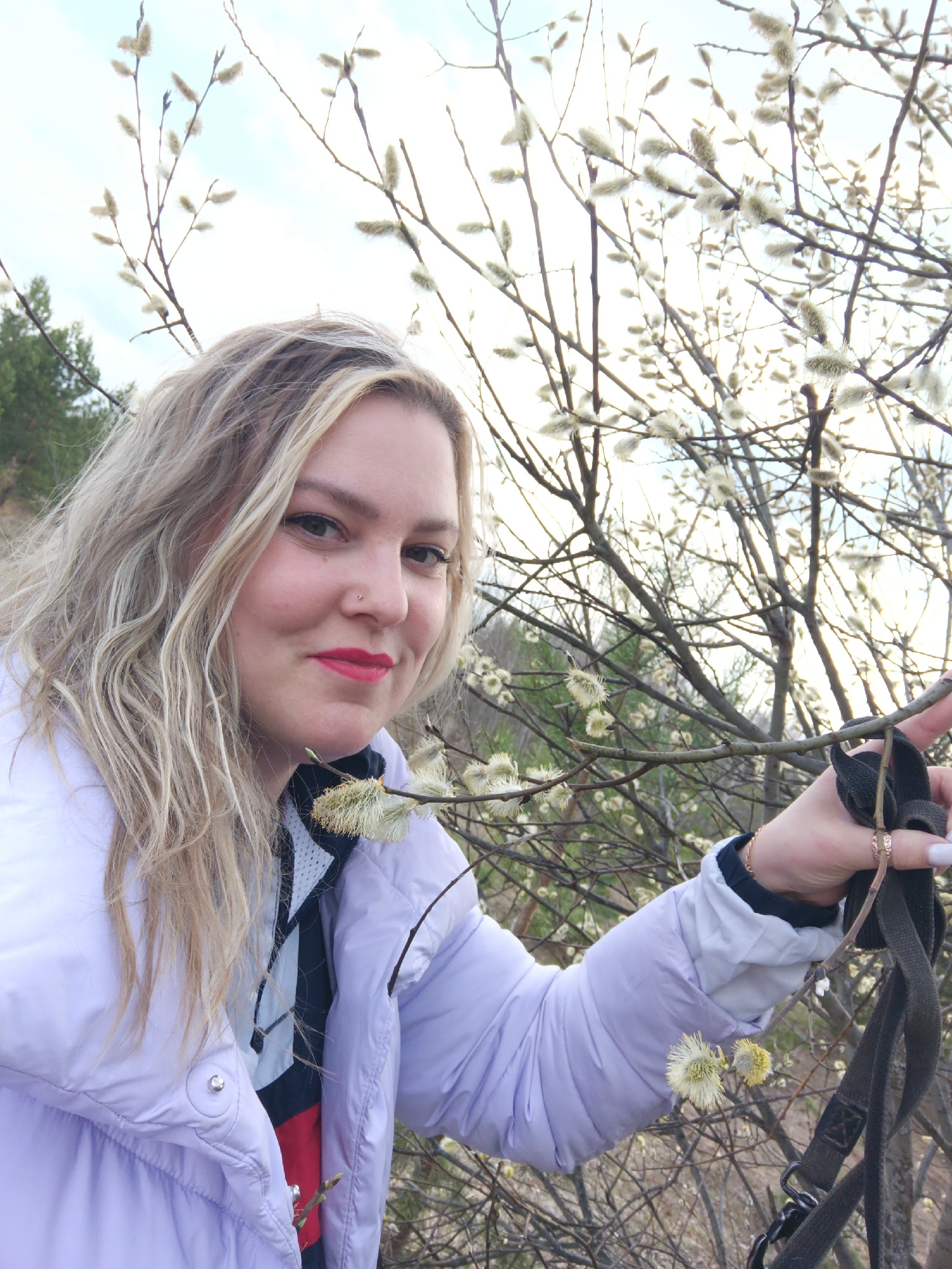 The image is a selfie taken in a location with pussy willow trees. A woman with blonde hair, red lipstick, and a nose piercing is the main subject. She is wearing a light purple puffer jacket and hold…read more