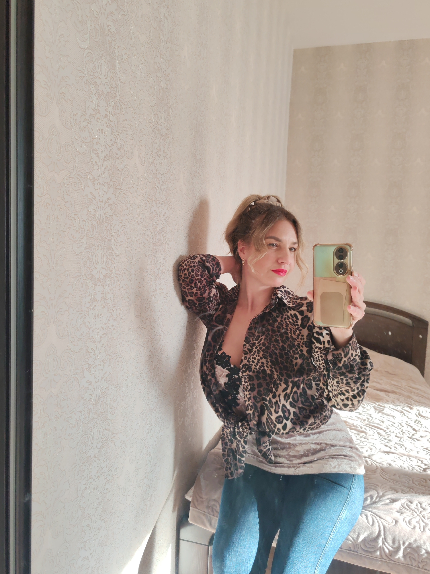 A woman is taking a selfie in what appears to be a bedroom. She is wearing a leopard print blouse, a velvet top, and blue jeans. She has her hair pulled back and is wearing earrings and red lipstick.…read more