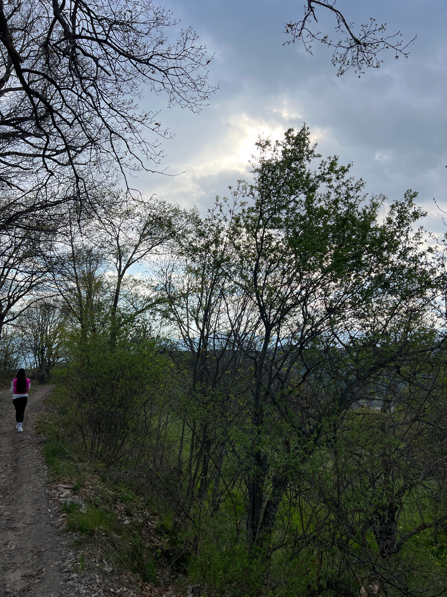 The image shows a path in a wooded area in Kribul, Bulgaria. The path is dirt and lined with trees and bushes on both sides. Some trees are bare, while others have green foliage. The sky is cloudy wit…read more