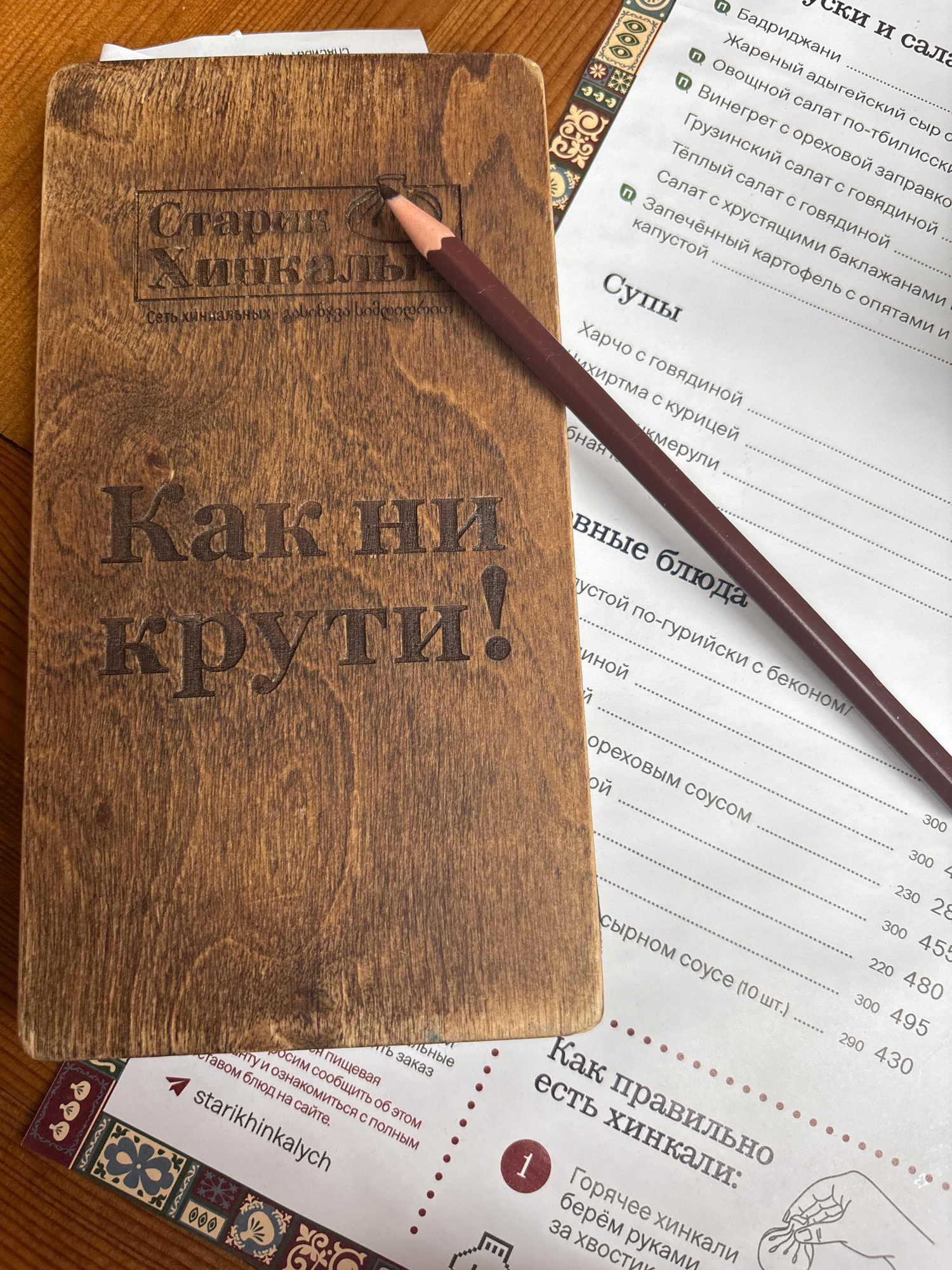 Here is a description of the image: The image depicts a menu from the restaurant "Starik Hinkalych" in Izhevsk, Russia. The menu has a wooden cover with the name of the restaurant engraved in Russian…read more