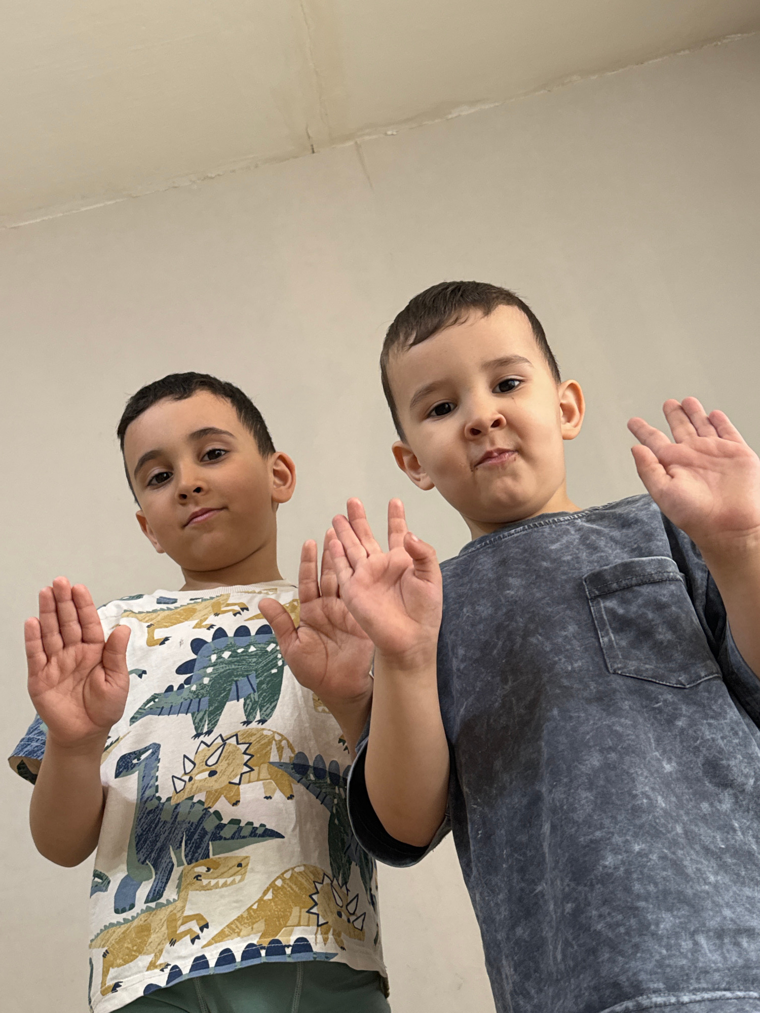 Two young boys are posing for the camera. The boy at the top of the image is wearing a gray shirt with a pocket, and the boy at the bottom is wearing a white shirt with a dinosaur print. Both boys are…read more