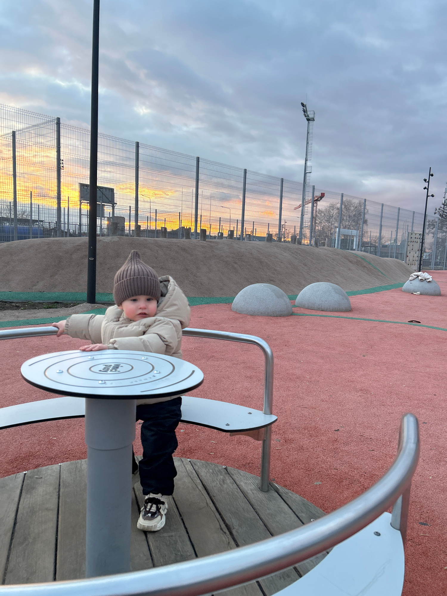 A baby wearing a tan winter hat and coat and black pants with white sneakers is playing on playground equipment. The equipment is a circular platform with metal bars. The playground has a red rubber s…read more