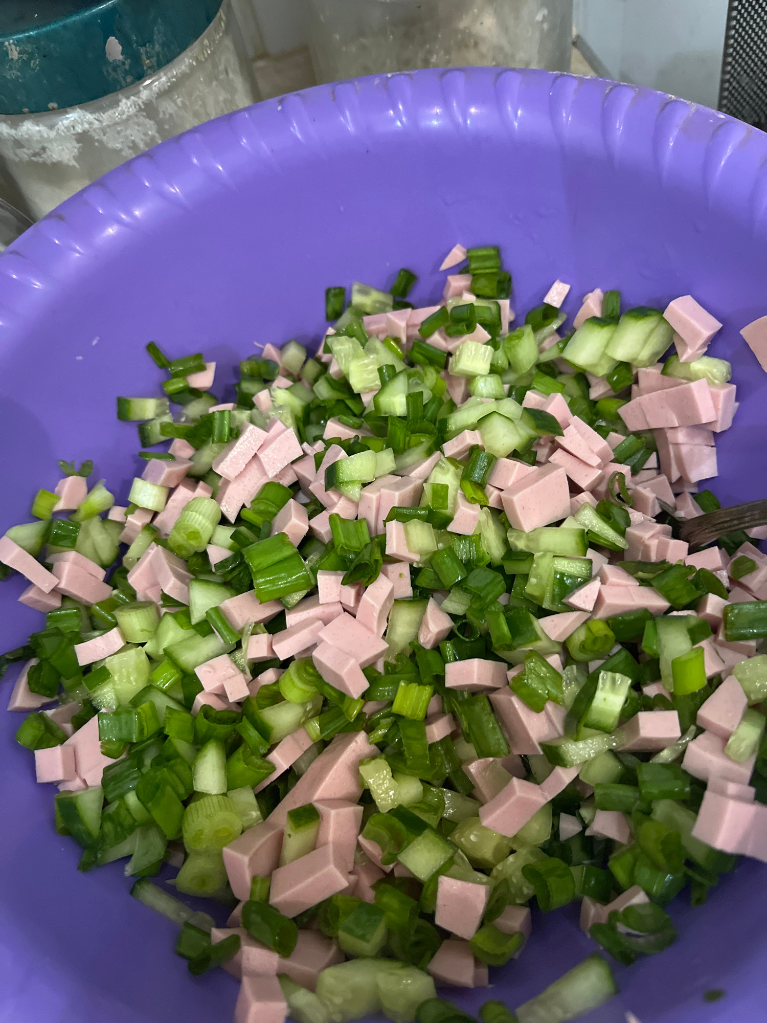 A vibrant purple plastic bowl, seen from a top-down perspective, is filled with a mixture of diced ingredients, indicative of food preparation in a kitchen. The main components are uniformly cut, ligh…read more