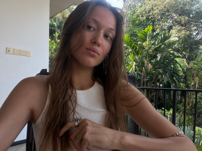 A young adult female is depicted in a medium shot, seated on an outdoor balcony in Unawatuna, Sri Lanka. She has long brown hair and wears a light-colored ribbed tank top. Her left hand is visible, fe…read more