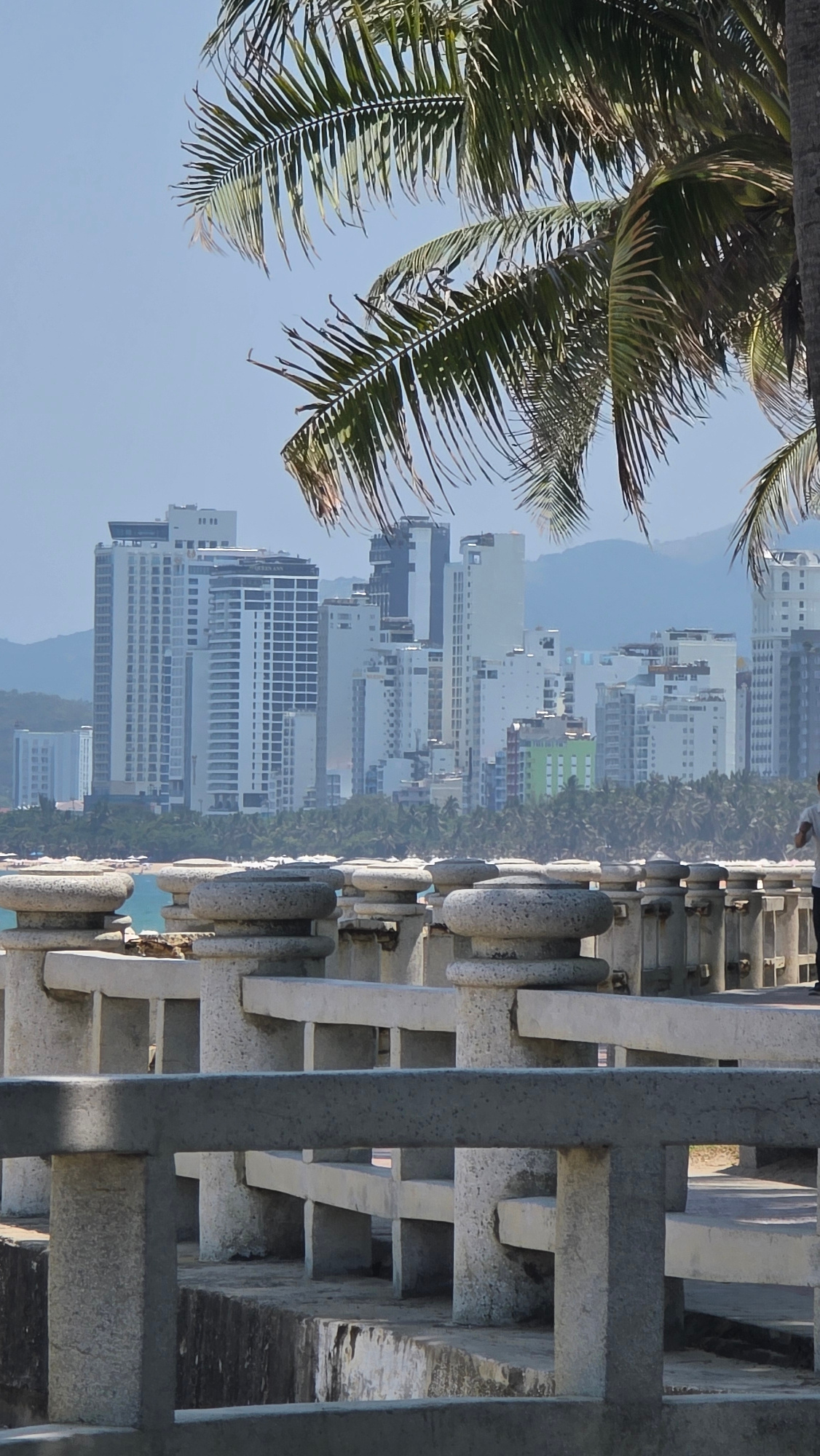 The image depicts a waterfront scene in Nha Trang, Vietnam, partially obscured by the fronds of a palm tree in the upper left corner. The skyline is dominated by numerous high-rise buildings. A gray c…read more