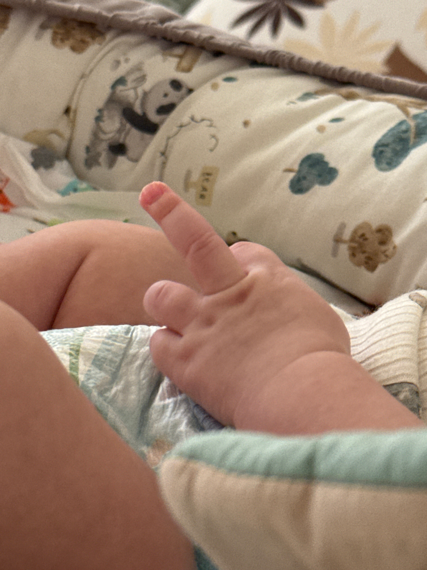 The image shows a baby lying down. The baby is wearing a diaper and a light-colored outfit with ribbing at the neckline. The baby's hand is visible, with a finger extended. The background features bed…read more