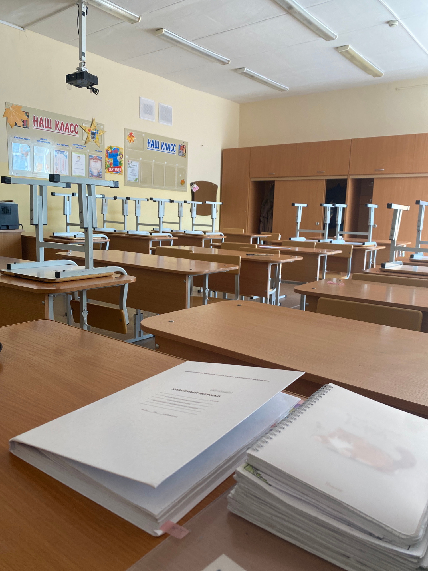 The image shows an empty classroom, likely in a school, in Chaikovsky, Russia. Rows of wooden desks and chairs occupy the foreground and middle ground. A large, light-colored cabinet spans the wall on…read more