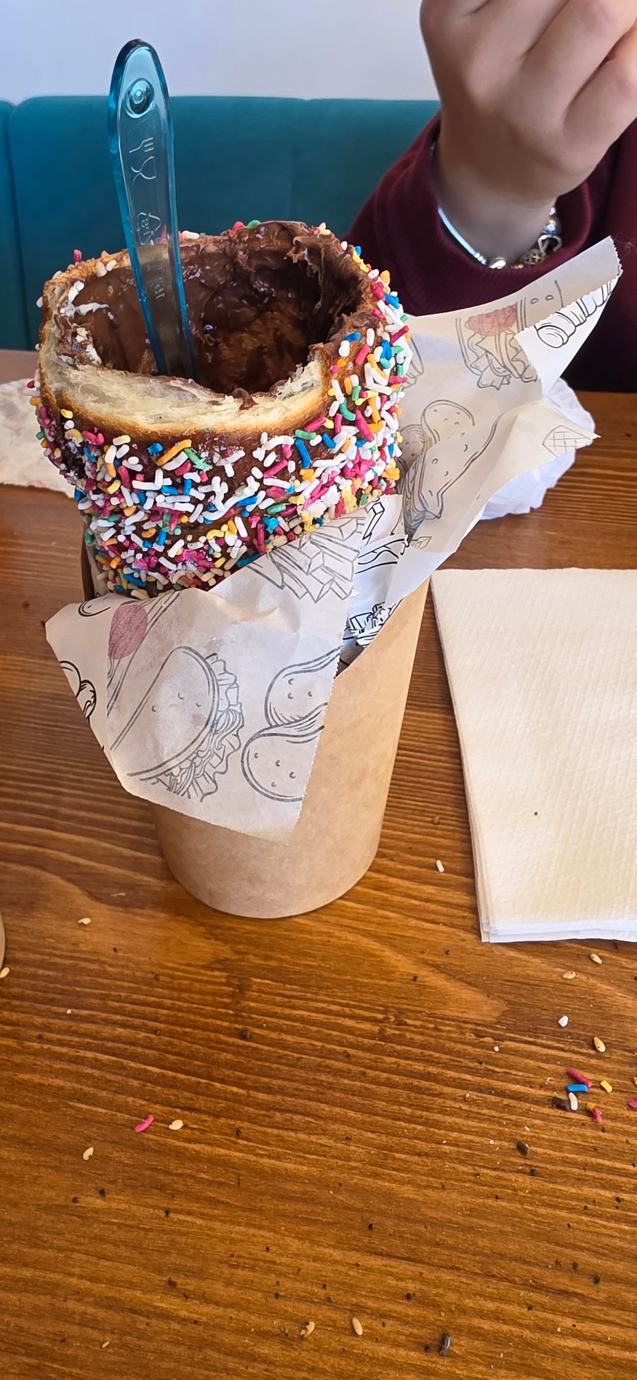 The image captures a sweet treat, a chimney cake, commonly known as "trdelník" in Central and Eastern Europe, being held in a brown paper cup on a wooden table. The pastry is coated with sprinkles and…read more