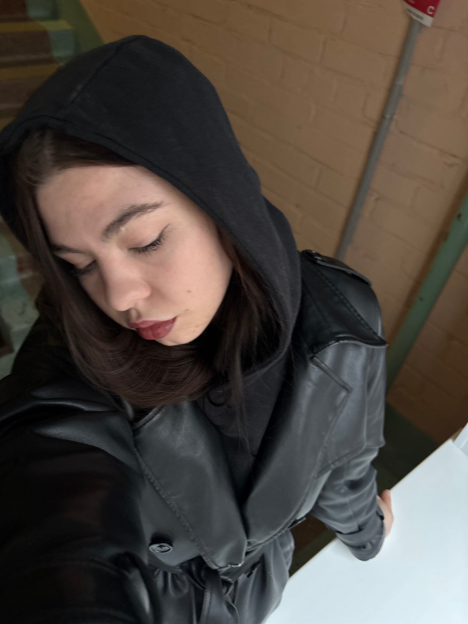 The image, rotated 90 degrees clockwise, presents a close-up of a person, likely female, from a slightly low-angle perspective. The person's head is positioned towards the left of the frame. They have…read more